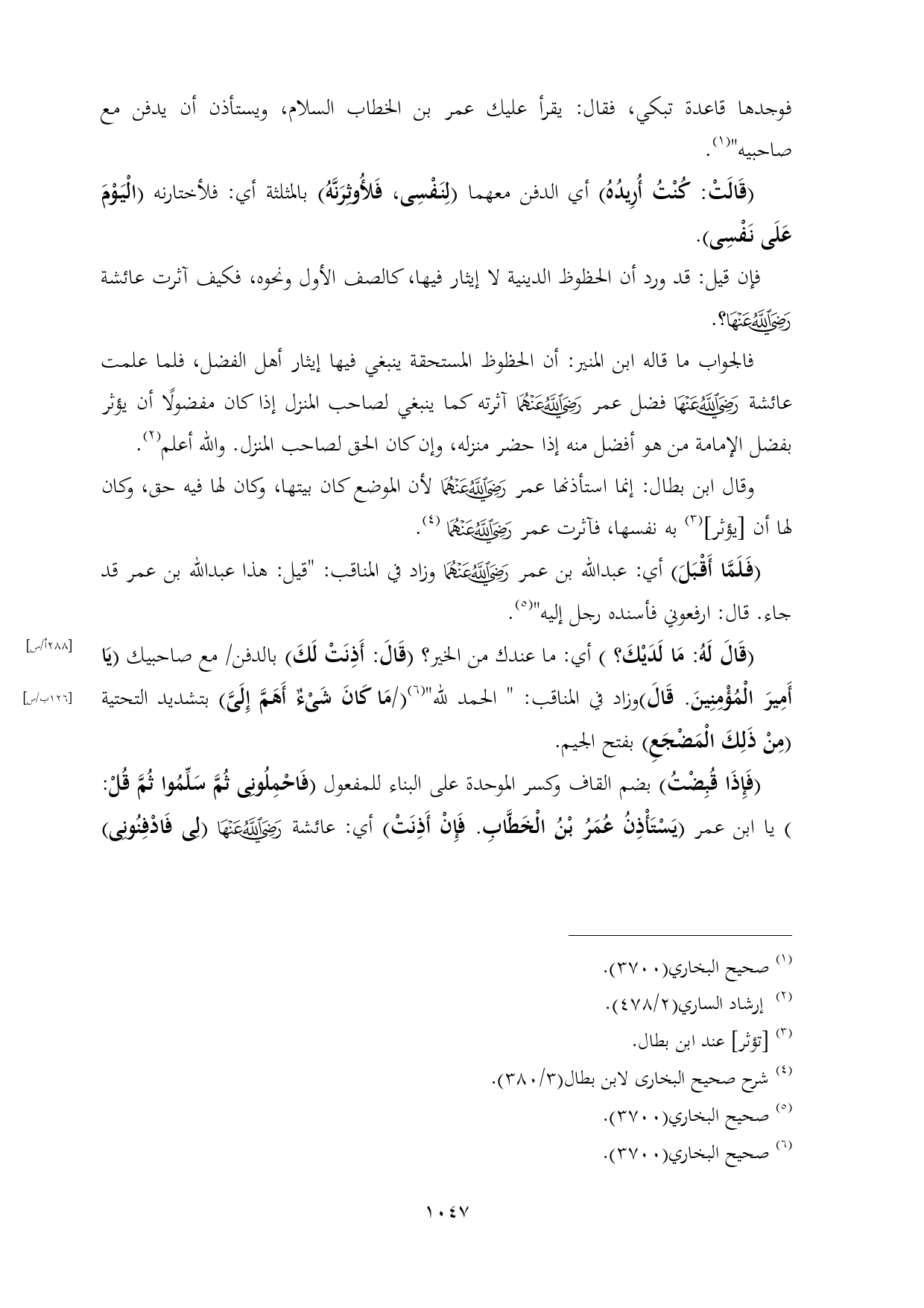 فالجواب ما قاله ابن المنير: أن الحظوظ المستحقة ينبغي فيها إيثار أهل الفضل، فلما علمت عائشة - رضي الله عنها - فضل عمر - رضي الله عنهما - آثرته كما ينبغي لصاحب المنزل إذا كان مفضولًا أن يؤثر بفضل الإمامة من هو أفضل منه إذا حضر منزله، وإن كان الحق لصاحب المنزل. والله أعلم (¬٢).