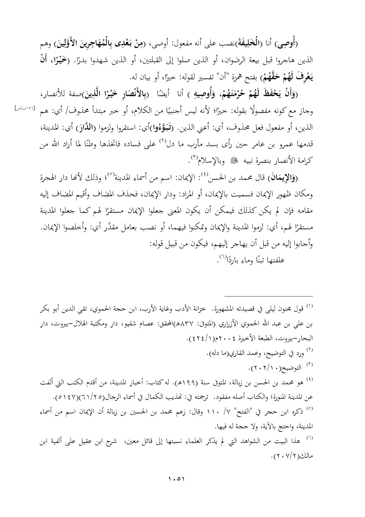 (وَأَنْ يَحْفَظَ لَهُمْ حُرْمَتَهُمْ، وَأُوصِيهِ) أنا أيضًا (بِالأَنْصَارِ خَيْرًا الَّذِينَ) صفة للأنصار, وجاز مع كونه مفصولًا بقوله: خيرًا؛ لأنه ليس أجنبيًا من الكلام، أو خبر مبتدأ محذوف/ أي: هم الذين، أو مفعول فعل محذوف، أي: أعني الذين. (تَبَوَّءُوا) أي: استقروا ولزموا (الدَّارَ) أي: المدينة، قدمها عمرو بن عامر حين رأى بسد مأرب ما دل (¬١) على فساده فاتخذها وطنًا لما أراد الله من كرامة الأنصار بنصرة نبيه - صلى الله عليه وسلم - وبالإسلام (¬٢).