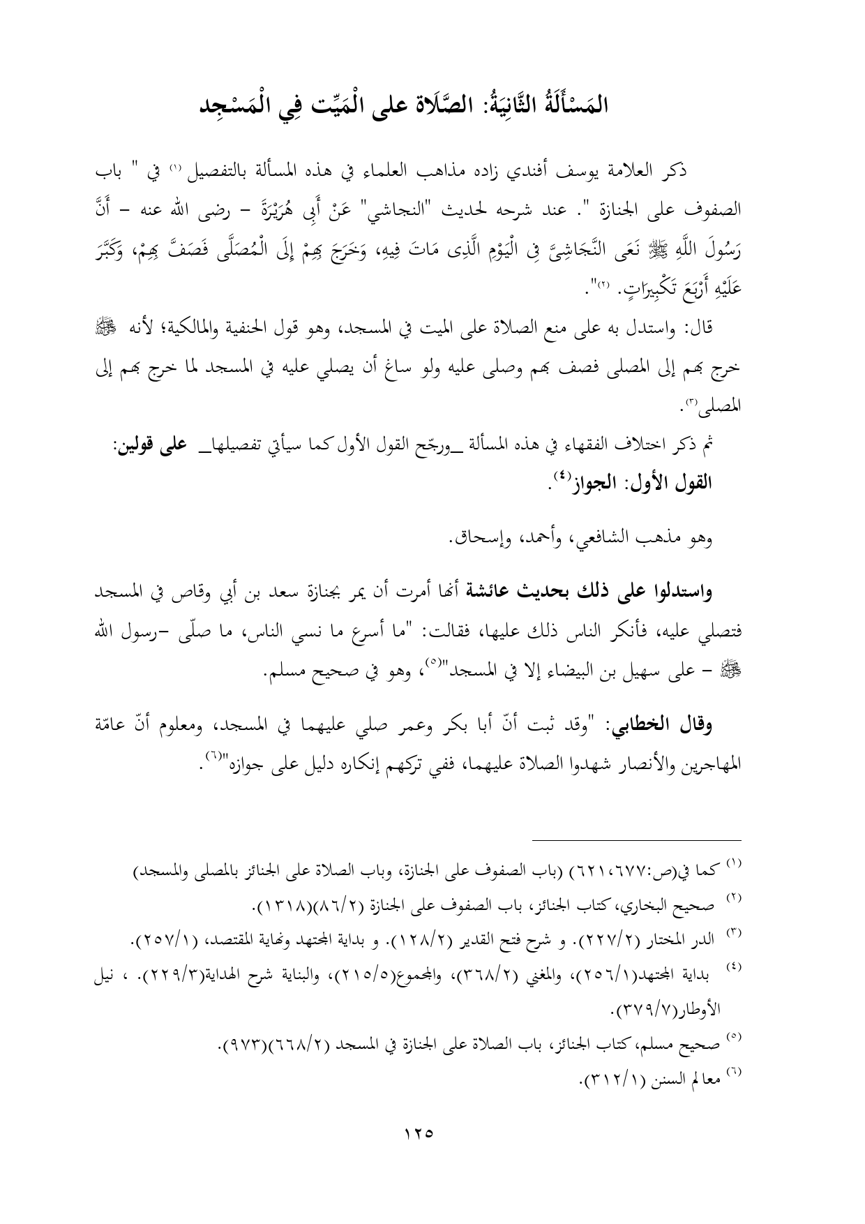 المَسْأَلَةُ الثَّانِيَةُ: الصَّلَاة على الْمَيِّت فِي الْمَسْجِد