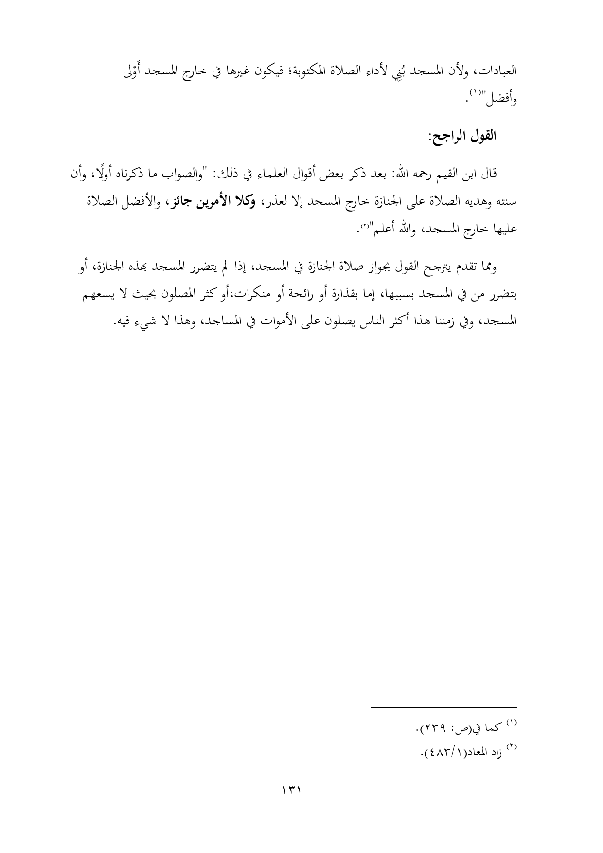 قال ابن القيم رحمه الله: بعد ذكر بعض أقوال العلماء في ذلك: "والصواب ما ذكرناه أولًا، وأن سنته وهديه الصلاة على الجنازة خارج المسجد إلا لعذر، وكلا الأمرين جائز، والأفضل الصلاة عليها خارج المسجد، والله أعلم" (¬٢).