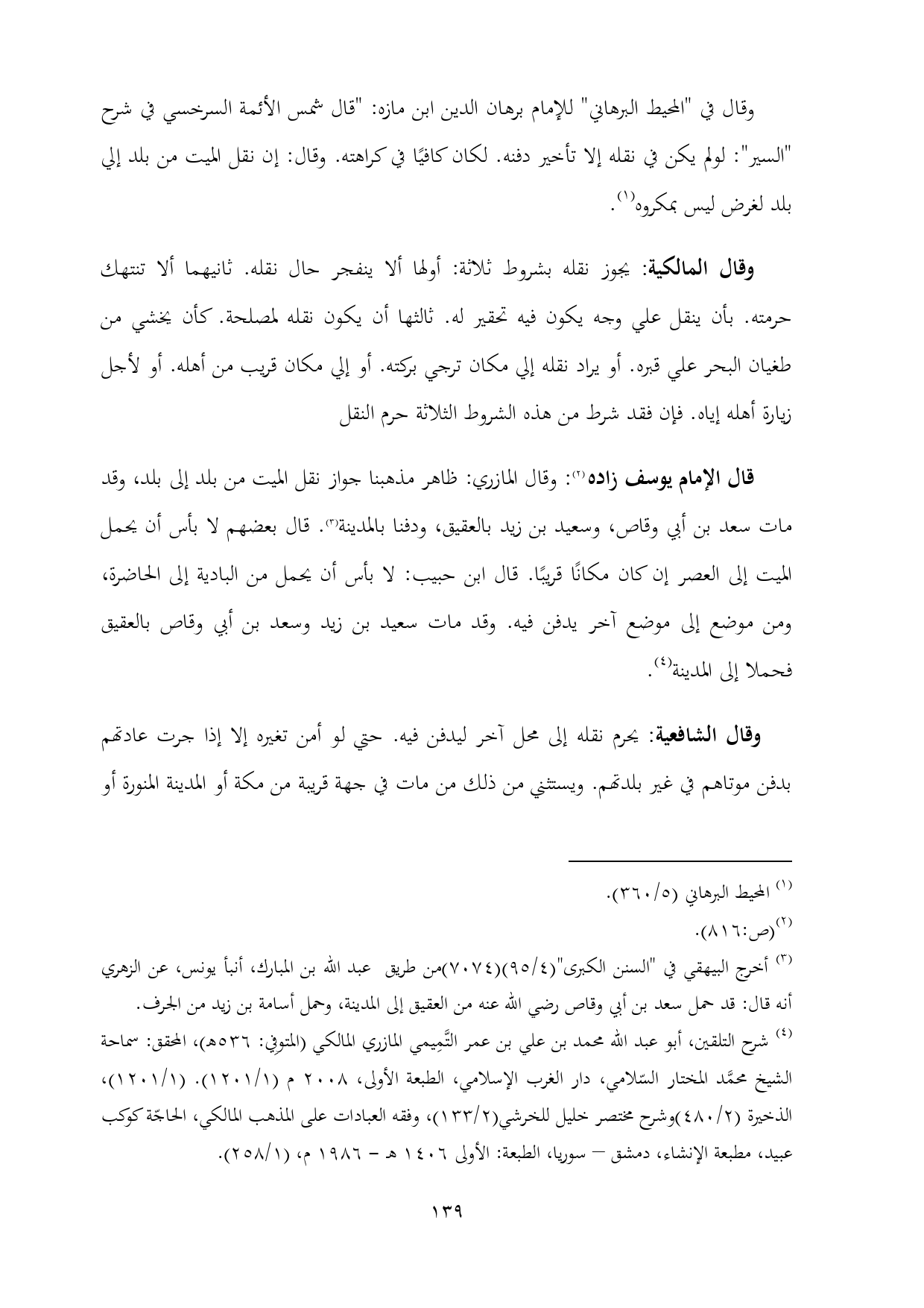 قال الإمام يوسف زاده (¬٢): وقال المازري: ظاهر مذهبنا جواز نقل الميت من بلد إلى بلد، وقد مات سعد بن أبي وقاص، وسعيد بن زيد بالعقيق، ودفنا بالمدينة (¬٣). قال بعضهم لا بأس أن يحمل الميت إلى العصر إن كان مكانًا قريبًا. قال ابن حبيب: لا بأس أن يحمل من البادية إلى الحاضرة، ومن موضع إلى موضع آخر يدفن فيه. وقد مات سعيد بن زيد وسعد بن أبي وقاص بالعقيق فحملا إلى المدينة (¬٤).