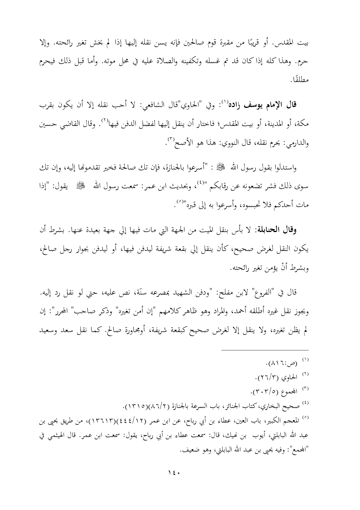 قال الإمام يوسف زاده (¬١): وفي "الحاوي"قال الشافعي: لا أحب نقله إلا أن يكون بقرب مكة، أو المدينة، أو بيت المقدس؛ فاختار أن ينقل إليها لفضل الدفن فيها (¬٢). وقال القاضي حسين والدارمي: يحرم نقله، قال النووي: هذا هو الأصح (¬٣).