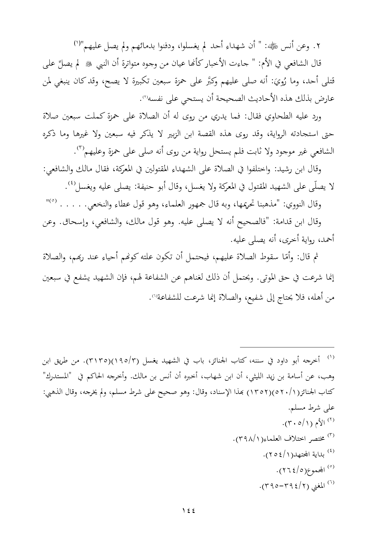 قال الشافعي في الأم: " جاءت الأخبار كأنها عيان من وجوه متواترة أن النبي - صلى الله عليه وسلم - لم يصلِّ على قتلى أحد، وما رُويَ: أنه صلى عليهم وكبَّر على حمزة سبعين تكبيرة لا يصح، وقد كان ينبغي لمن عارض بذلك هذه الأحاديث الصحيحة أن يستحي على نفسه (¬٢).