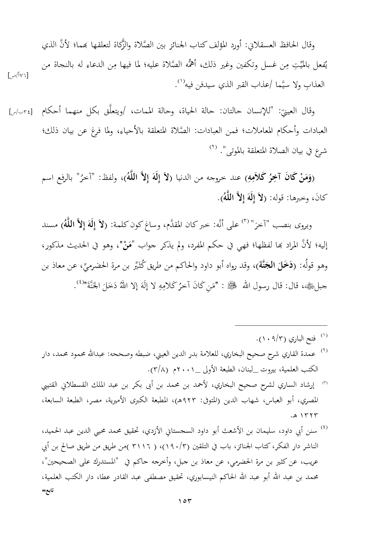 وقال العينيّ: "للإنسان حالتان: حالة الحياة، وحالة الممات، /ويتعلَّق بكل منهما أحكام العبادات وأحكام المعاملات؛ فمن العبادات: الصَّلاة المتعلقة بالأحياء، ولما فرغ عن بيان ذلك؛ شرع في بيان الصلاة المتعلقة بالموتى". (¬٢)