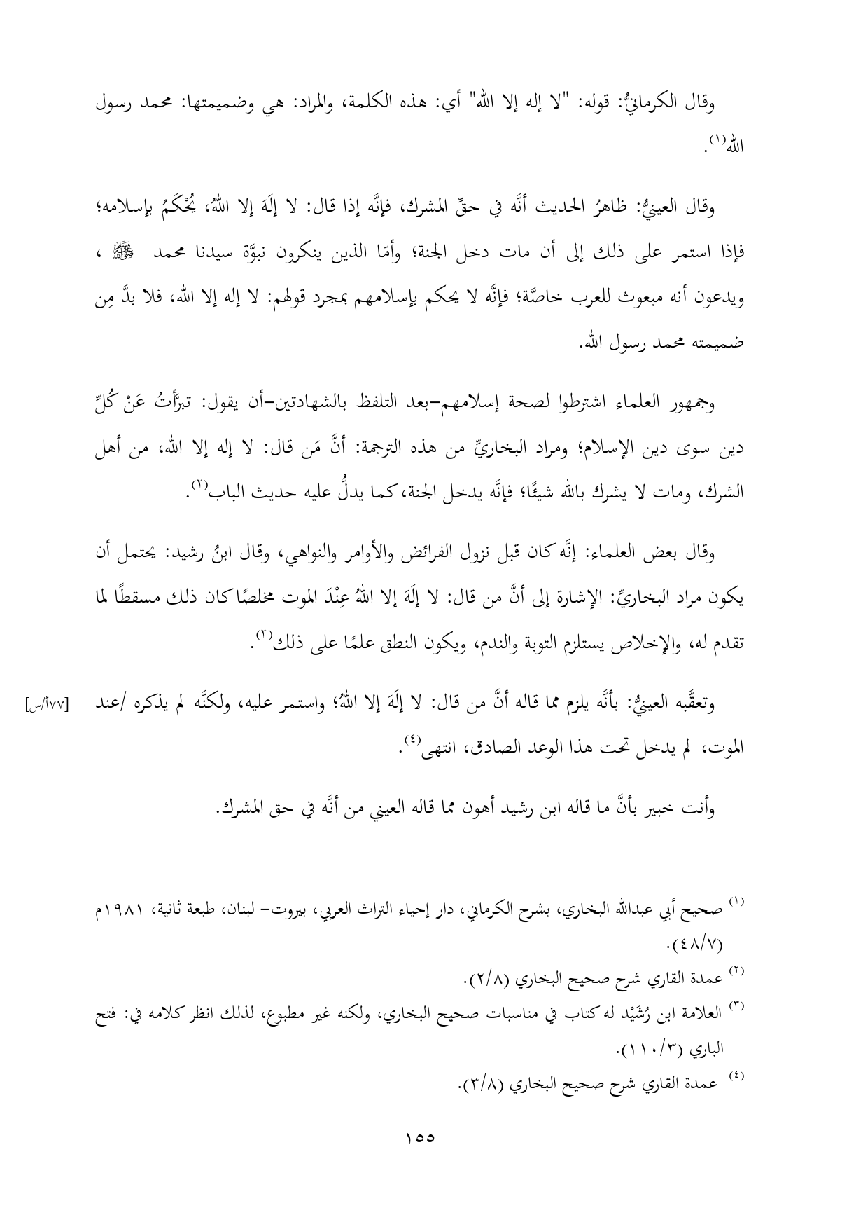 وجمهور العلماء اشترطوا لصحة إسلامهم-بعد التلفظ بالشهادتين-أن يقول: تبرَّأتُ عَنْ كُلِّ دين سوى دين الإسلام؛ ومراد البخاريِّ من هذه الترجمة: أنَّ مَن قال: لا إله إلا الله، من أهل الشرك، ومات لا يشرك بالله شيئًا؛ فإنَّه يدخل الجنة، كما يدلُّ عليه حديث الباب (¬٢).
