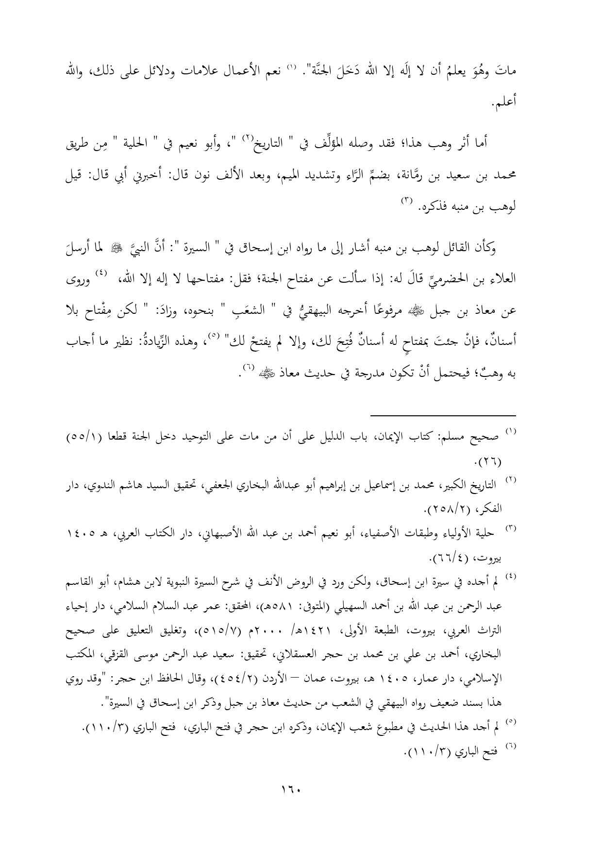 (¬٤) لم أجده في سيرة ابن إسحاق، ولكن ورد في الروض الأنف في شرح السيرة النبوية لابن هشام، أبو القاسم عبد الرحمن بن عبد الله بن أحمد السهيلي (المتوفى: ٥٨١ هـ)، المحقق: عمر عبد السلام السلامي، دار إحياء التراث العربي، بيروت، الطبعة الأولى، ١٤٢١ هـ/ ٢٠٠٠ م (٧/ ٥١٥)، وتغليق التعليق على صحيح البخاري، أحمد بن علي بن محمد بن حجر العسقلاني، تحقيق: سعيد عبد الرحمن موسى القزقي، المكتب الإسلامي، دار عمار، ١٤٠٥ هـ، بيروت، عمان - الأردن (٢/ ٤٥٤)، وقال الحافظ ابن حجر: "وقد روي هذا بسند ضعيف رواه البيهقي في الشعب من حديث معاذ بن جبل وذكر ابن إسحاق في السيرة".