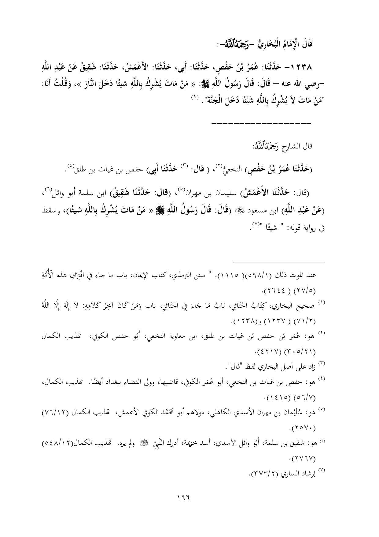 ١٢٣٨ - حَدَّثَنَا: عُمَرُ بْنُ حَفْصٍ، حَدَّثَنَا: أَبِى، حَدَّثَنَا: الأَعْمَشُ، حَدَّثَنَا: شَقِيقٌ عَنْ عَبْدِ اللَّهِ -رضي الله عنه - قَالَ: قَالَ رَسُولُ اللَّهِ - صلى الله عليه وسلم -: «مَنْ مَاتَ يُشْرِكُ بِاللَّهِ شيئًا دَخَلَ النَّارَ»، وَقُلْتُ أَنَا: "مَنْ مَاتَ لَا يُشْرِكُ بِاللَّهِ شَيْئًا دَخَلَ الْجَنَّةَ". (¬١)