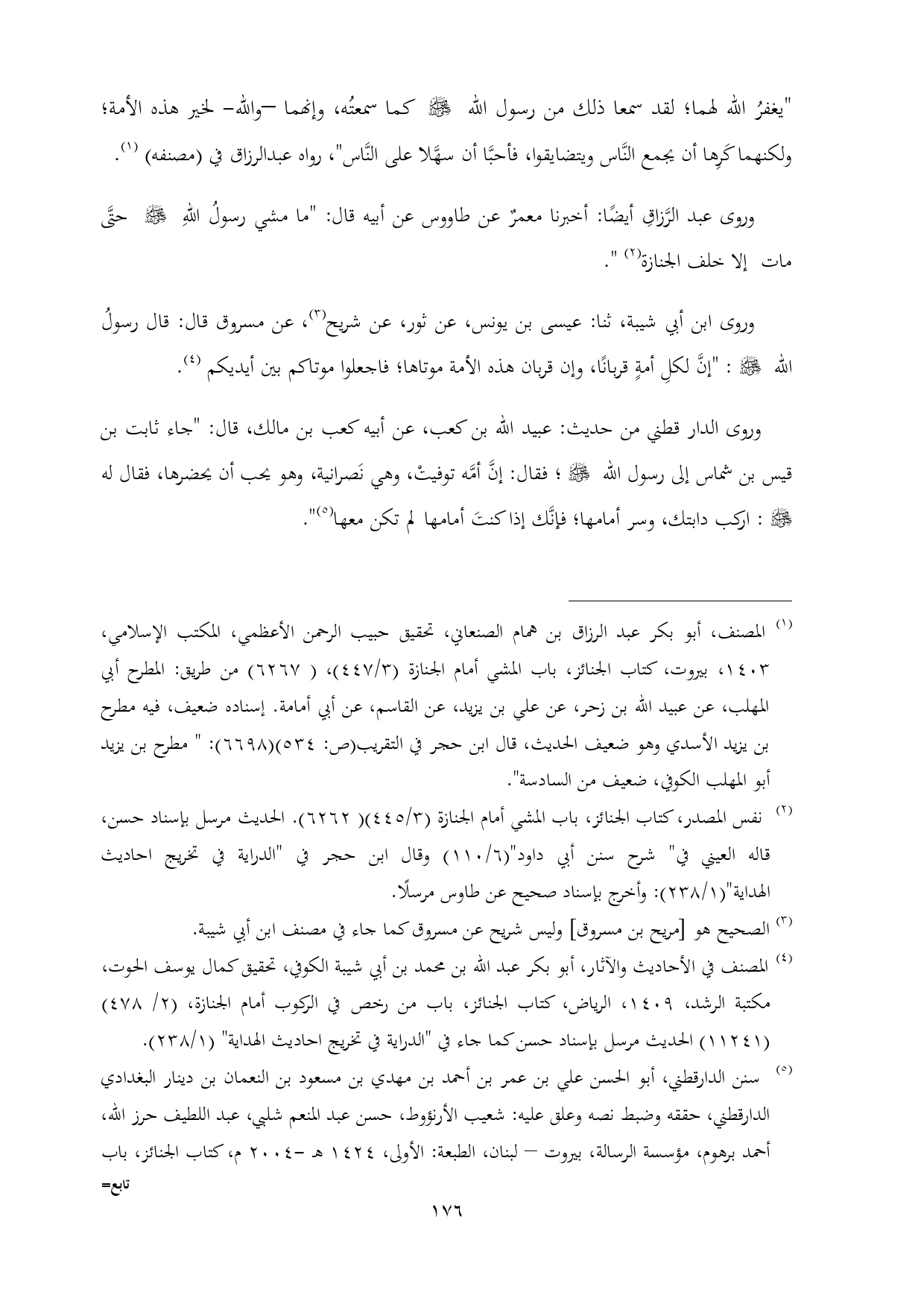 (¬٤) المصنف في الأحاديث والآثار، أبو بكر عبد الله بن محمد بن أبي شيبة الكوفي، تحقيق كمال يوسف الحوت، مكتبة الرشد، ١٤٠٩، الرياض، كتاب الجنائز، باب من رخص في الركوب أمام الجنازة، (٢/ ٤٧٨) (١١٢٤١) الحديث مرسل بإسناد حسن كما جاء في "الدراية في تخريج احاديث الهداية" (١/ ٢٣٨).