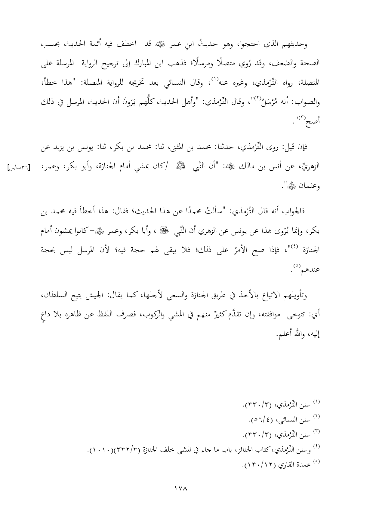 فالجواب أنه قال التِّرْمذي: "سألتُ محمدًا عن هذا الحديث؛ فقال: هذا أخطأ فيه محمد بن بكر، وإنما يُرْوى هذا عن يونس عن الزهري أن النَّبي - صلى الله عليه وسلم -، وأبا بكر، وعمر - رضي الله عنهم - كانوا يمشون أمام الجنازة (¬٤) "، فإذا صح الأمرُ على ذلك؛ فلا يبقى لهم حجة فيه؛ لأن المرسل ليس بحجة عندهم (¬٥).