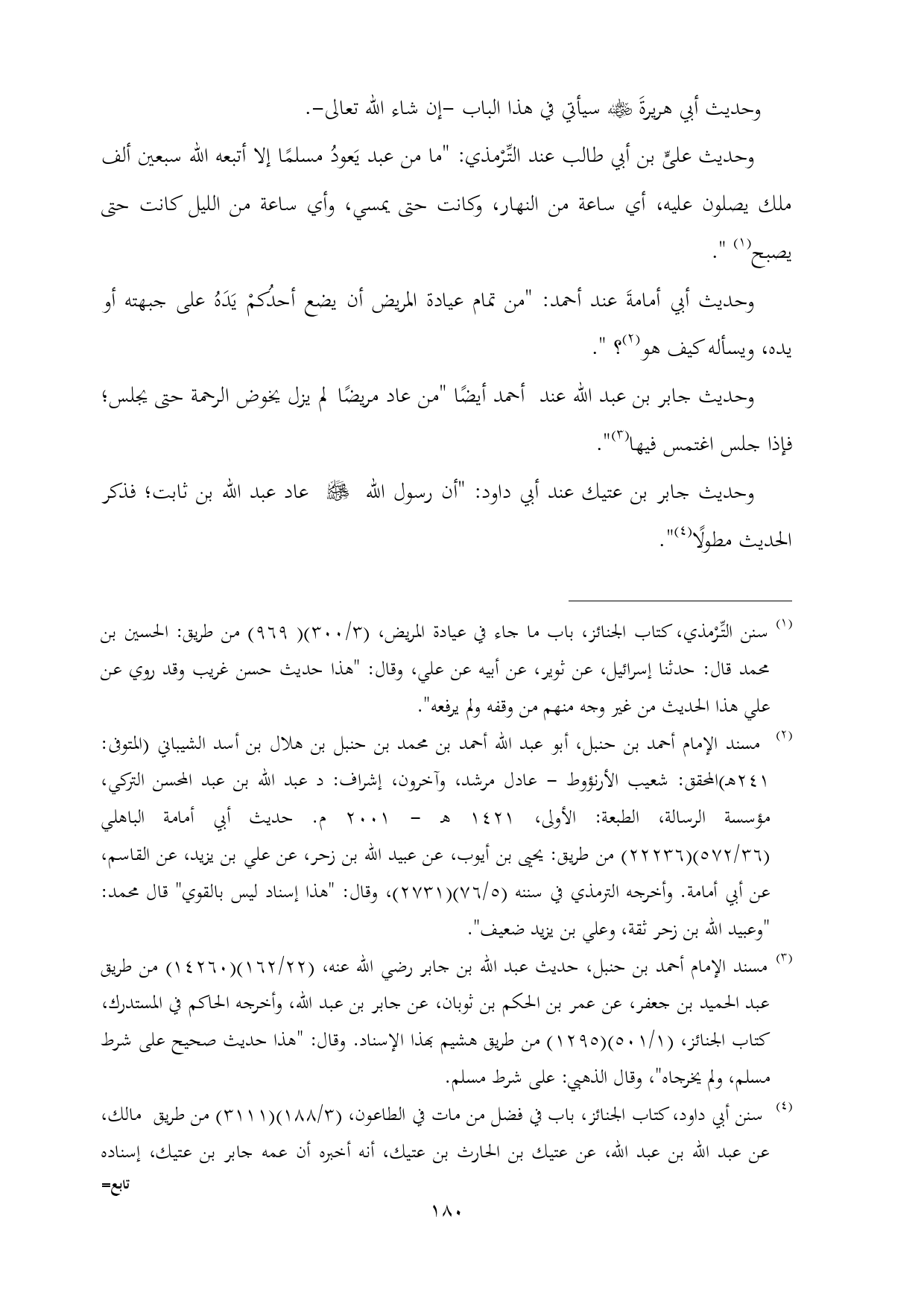 وحديث علىٍّ بن أبي طالب عند التِّرْمذي: "ما من عبد يَعودُ مسلمًا إلا أتبعه الله سبعين ألف ملك يصلون عليه، أي ساعة من النهار، وكانت حتى يمسي، وأي ساعة من الليل كانت حتى يصبح (¬١) ".