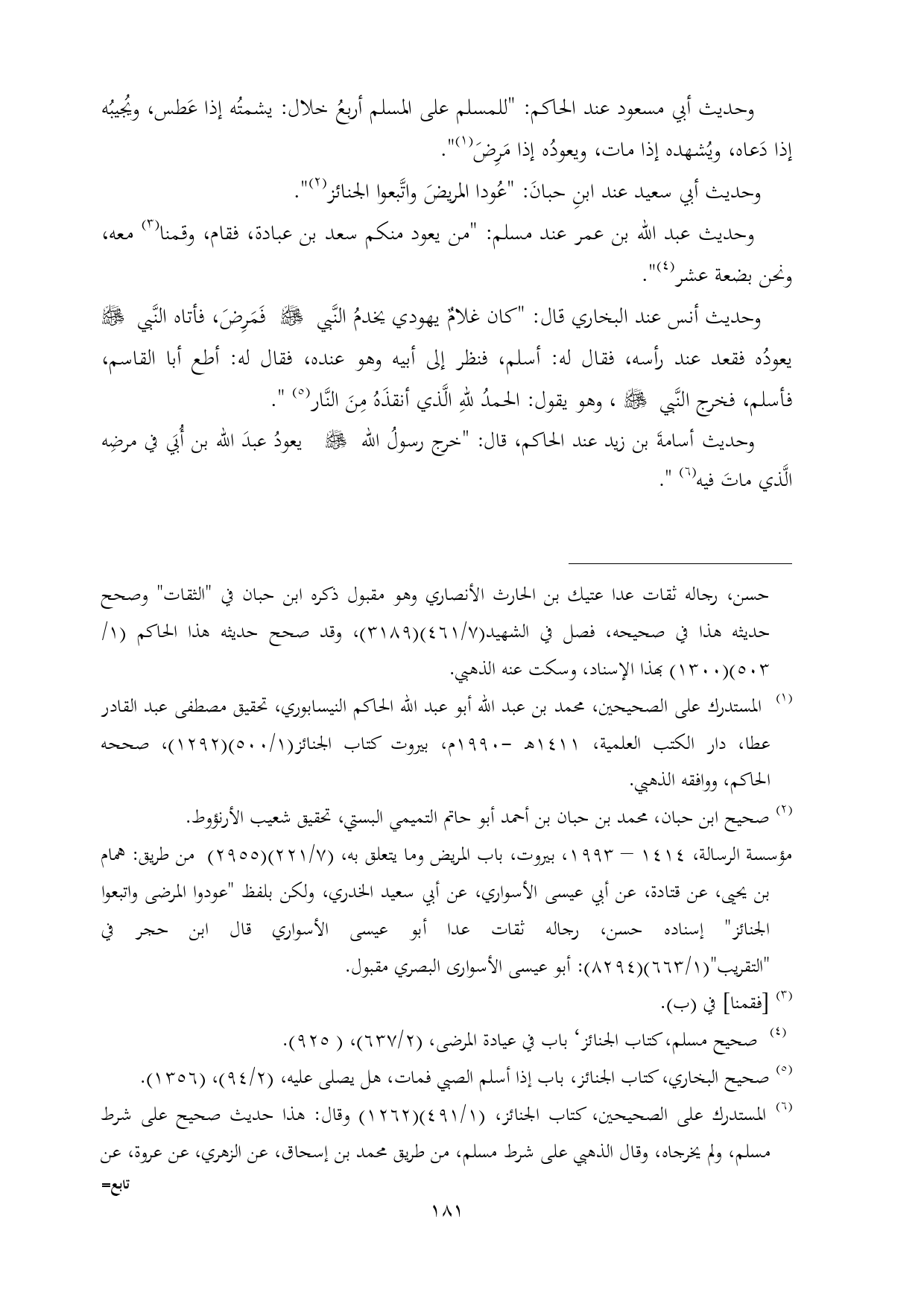 (¬١) المستدرك على الصحيحين، محمد بن عبد الله أبو عبد الله الحاكم النيسابوري، تحقيق مصطفى عبد القادر عطا، دار الكتب العلمية، ١٤١١ هـ -١٩٩٠ م، بيروت كتاب الجنائز (١/ ٥٠٠) (١٢٩٢)، صححه الحاكم، ووافقه الذهبي.