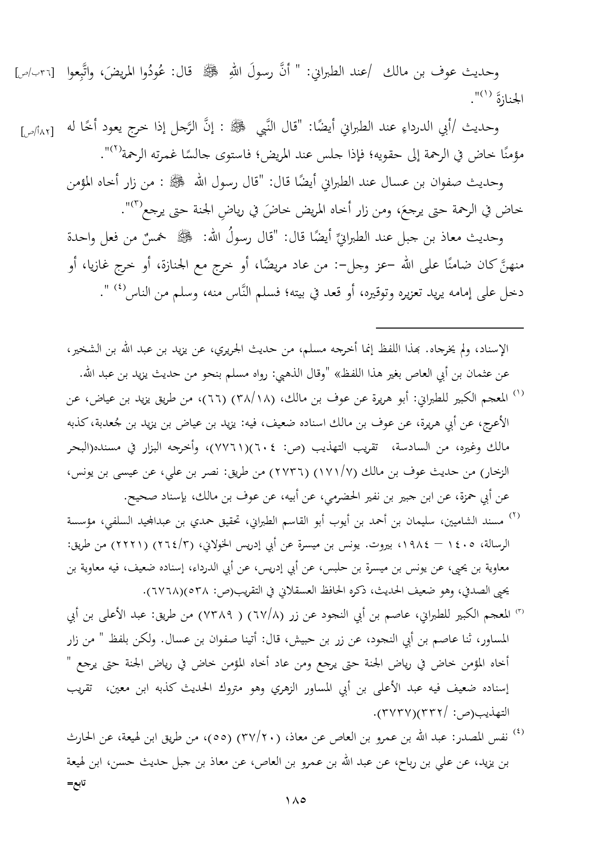 وحديث صفوان بن عسال عند الطبراني أيضًا قال: "قال رسول الله - صلى الله عليه وسلم -: من زار أخاه المؤمن خاض في الرحمة حتى يرجعَ، ومن زار أخاه المريض خاضَ في رياضِ الجنة حتى يرجع (¬٣) ".