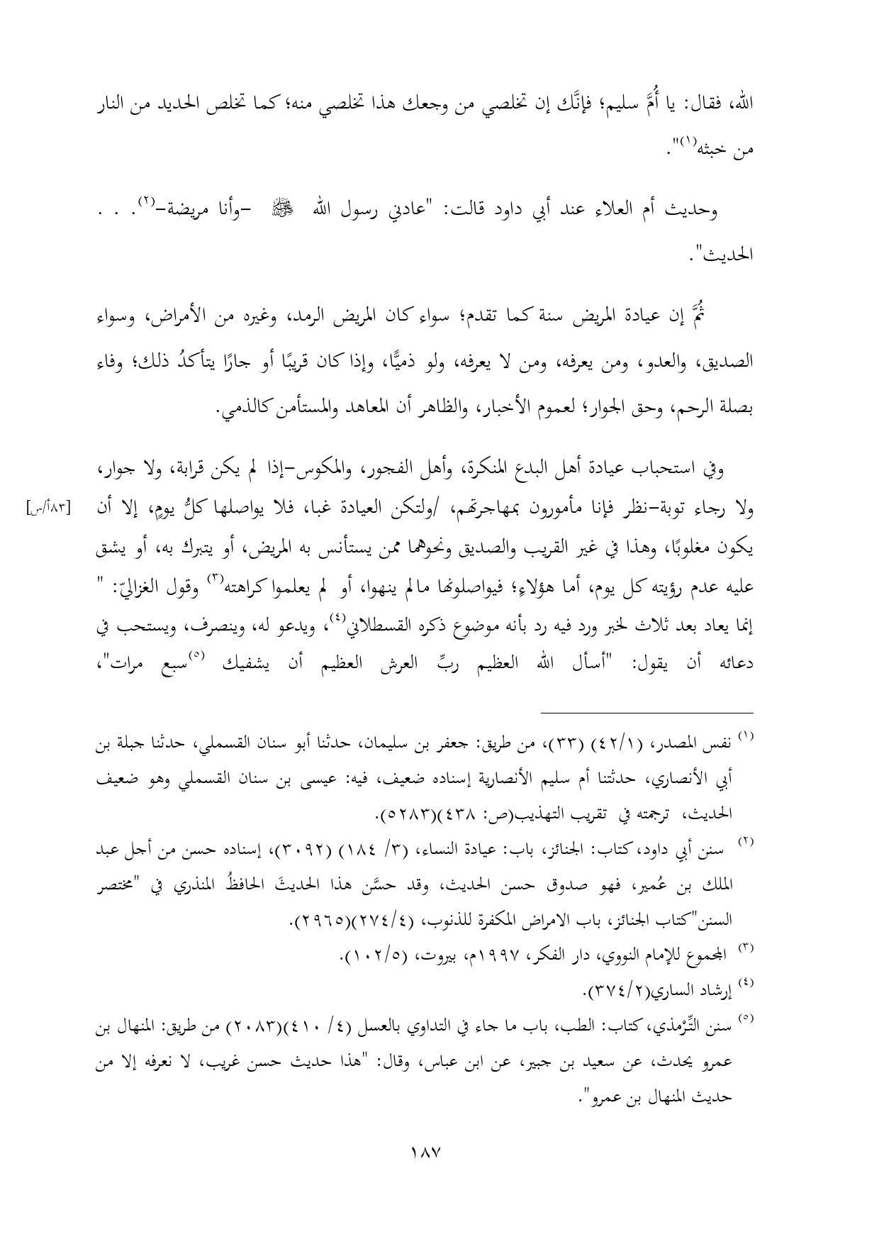 وحديث أم العلاء عند أبي داود قالت: "عادني رسول الله - صلى الله عليه وسلم - وأنا مريضة- (¬٢). . . الحديث".