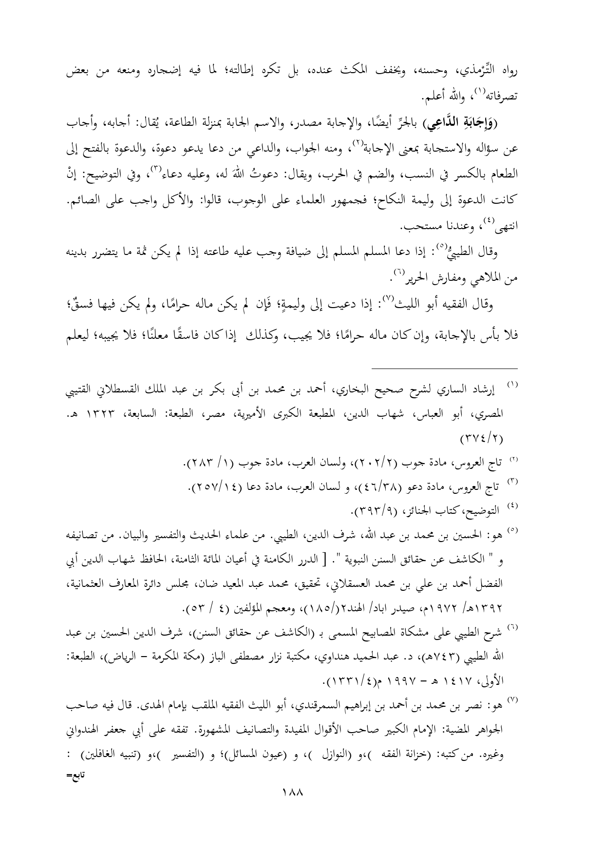 وقال الطيبيُّ (¬٥): إذا دعا المسلم المسلم إلى ضيافة وجب عليه طاعته إذا لم يكن ثمة ما يتضرر بدينه من الملاهي ومفارش الحرير (¬٦).