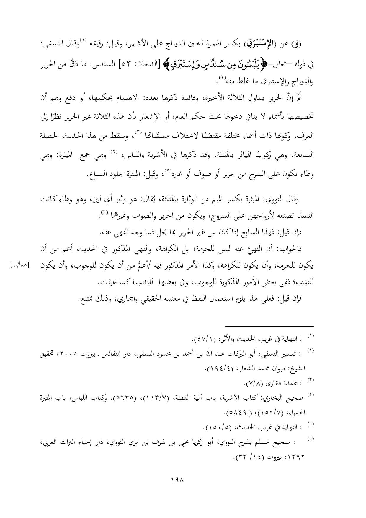 (وَ) عن (الإِسْتَبْرَقِ) بكسر الهمزة ثخين الديباج على الأشهر، وقيل: رقيقه (¬١) وقال النسفي: في قوله -تعالى- {يَلْبَسُونَ مِنْ سُنْدُسٍ وَإِسْتَبْرَقٍ} [الدخان: ٥٣] السندس: ما دَقَّ من الحرير والديباج والإستبراق ما غلظ منه (¬٢).