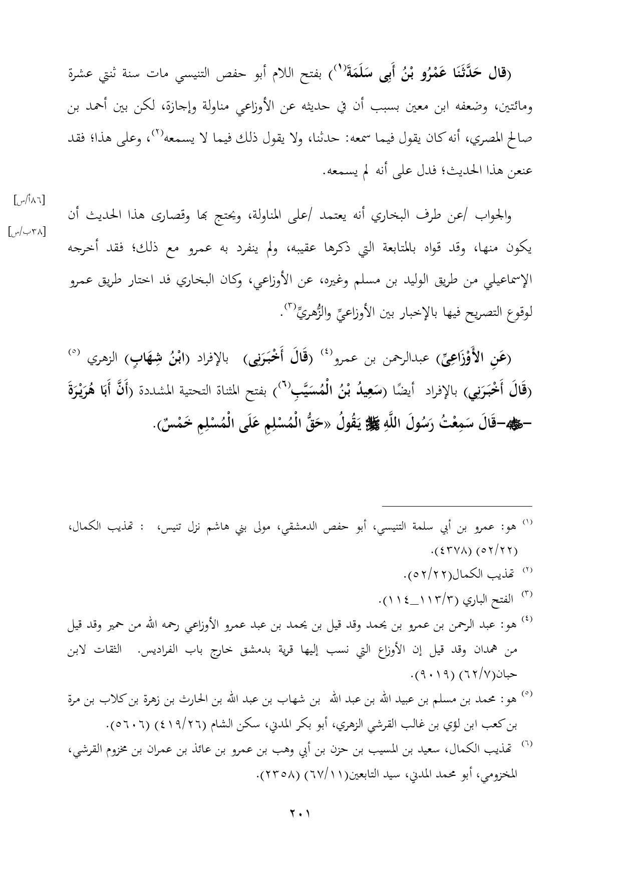 والجواب /عن طرف البخاري أنه يعتمد /على المناولة، ويحتج بها وقصارى هذا الحديث أن يكون منها، وقد قواه بالمتابعة التي ذكرها عقيبه، ولم ينفرد به عمرو مع ذلك؛ فقد أخرجه الإسماعيلي من طريق الوليد بن مسلم وغيره، عن الأوزاعي، وكان البخاري فد اختار طريق عمرو لوقوع التصريح فيها بالإخبار بين الأوزاعيِّ والزُّهريِّ (¬٣).