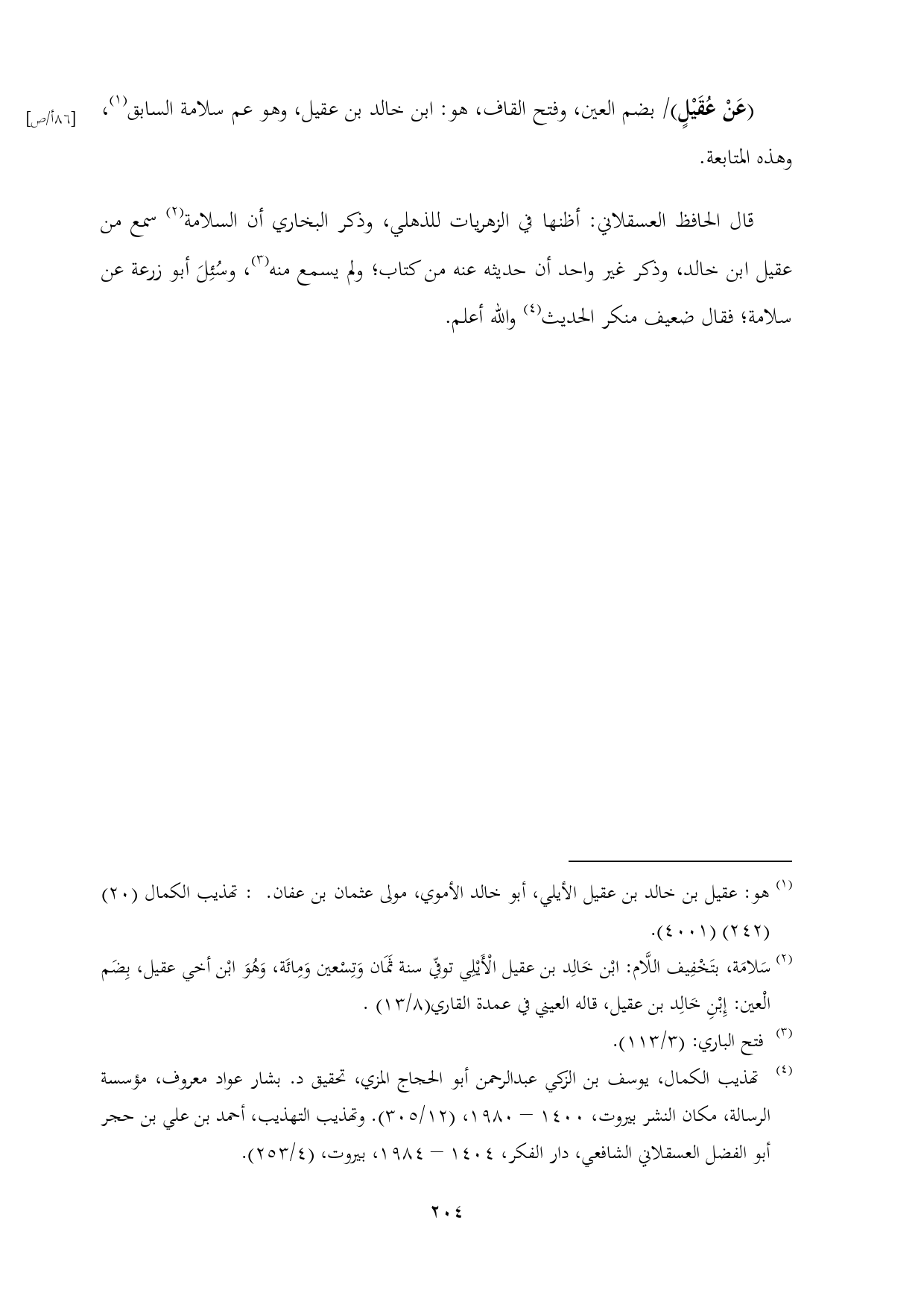 (¬٢) سَلامَة، بتَخْفِيف اللَّام: ابْن خَالِد بن عقيل الْأَيْلِي توفّي سنة ثَمَان وَتِسْعين وَمِائَة، وَهُوَ ابْن أخي عقيل، بِضَم الْعين: إِبْنِ خَالِد بن عقيل، قاله العيني في عمدة القاري (٨/ ١٣).