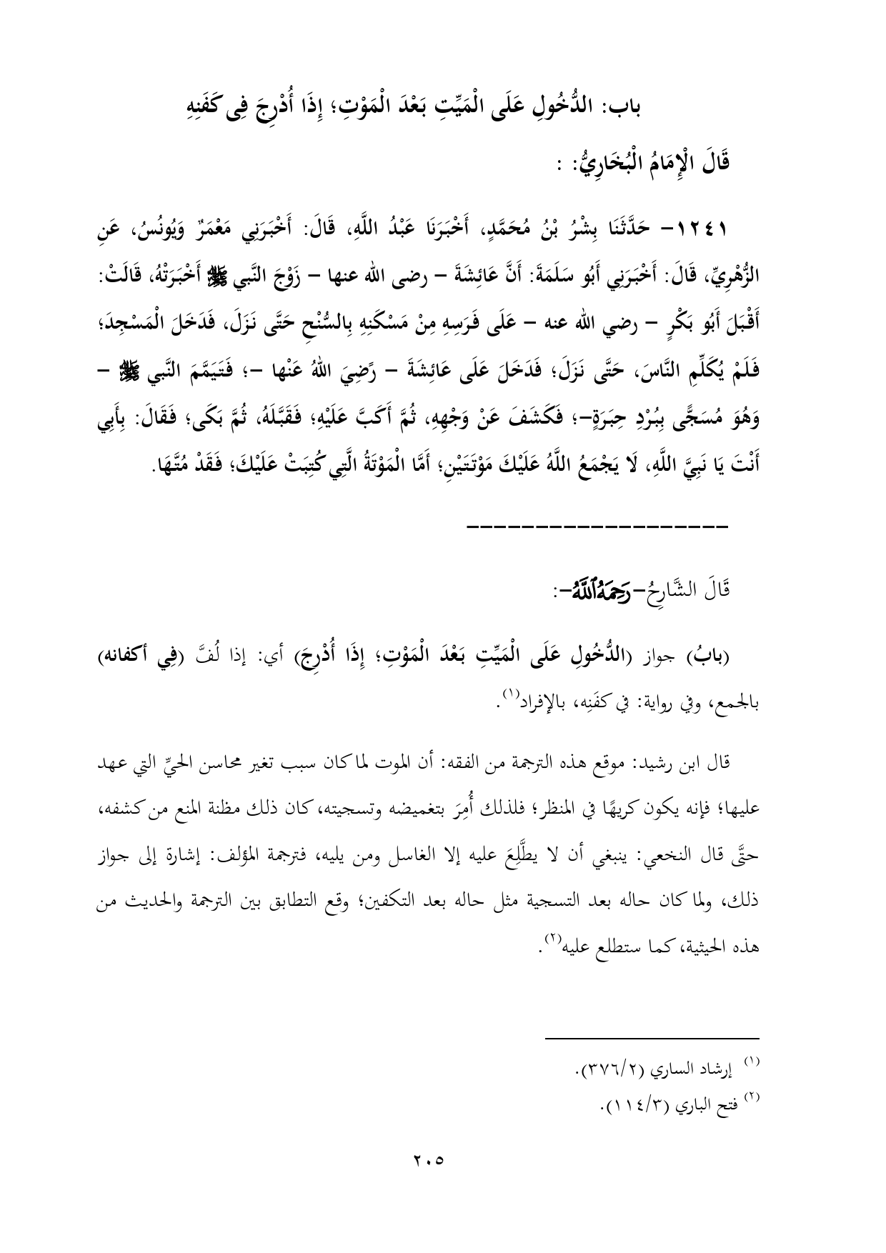 ١٢٤١ - حَدَّثَنَا بِشْرُ بْنُ مُحَمَّدٍ، أَخْبَرَنَا عَبْدُ اللَّهِ، قَالَ: أَخْبَرَنِي مَعْمَرٌ وَيُونُسُ، عَنِ الزُّهْرِيِّ، قَالَ: أَخْبَرَنِي أَبُو سَلَمَةَ: أَنَّ عَائِشَةَ - رضى الله عنها - زَوْجَ النَّبي - صلى الله عليه وسلم - أَخْبَرَتْهُ، قَالَتْ: أَقْبَلَ أَبُو بَكْرٍ - رضي الله عنه - عَلَى فَرَسِهِ مِنْ مَسْكَنِهِ بِالسُّنْحِ حَتَّى نَزَلَ، فَدَخَلَ الْمَسْجِدَ؛ فَلَمْ يُكَلِّمِ النَّاسَ، حَتَّى نَزَلَ؛ فَدَخَلَ عَلَى عَائِشَةَ - رًضِيَ اللهُ عَنْها -؛ فَتَيَمَّمَ النَّبي - صلى الله عليه وسلم - وَهُوَ مُسَجًّى بِبُرْدِ حِبَرَةٍ-؛ فَكَشَفَ عَنْ وَجْهِهِ، ثُمَّ أَكَبَّ عَلَيْهِ؛ فَقَبَّلَهُ، ثُمَّ بَكَى؛ فَقَالَ: بِأَبِي أَنْتَ يَا نَبِيَّ اللَّهِ، لَا يَجْمَعُ اللَّهُ عَلَيْكَ مَوْتَتَيْنِ؛ أَمَّا الْمَوْتَةُ الَّتِي كُتِبَتْ عَلَيْكَ؛ فَقَدْ مُتَّهَا.