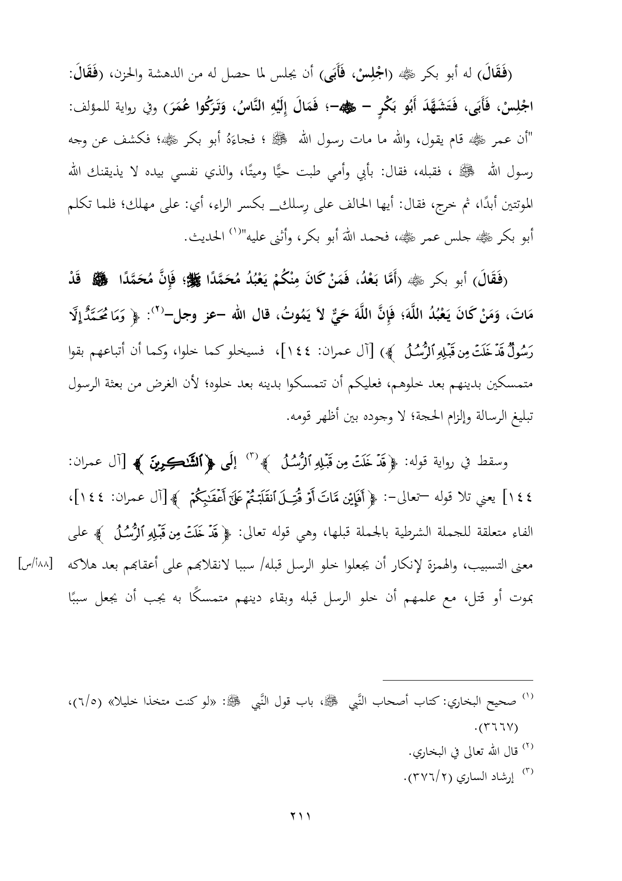 (فَقَالَ) أبو بكر - رضي الله عنه - (أَمَّا بَعْدُ، فَمَنْ كَانَ مِنْكُمْ يَعْبُدُ مُحَمَّدًا - صلى الله عليه وسلم -؛ فَإِنَّ مُحَمَّدًا - صلى الله عليه وسلم - قَدْ مَاتَ، وَمَنْ كَانَ يَعْبُدُ اللَّهَ؛ فَإِنَّ اللَّهَ حَيٌّ لَا يَمُوتُ، قال الله -عز وجل- (¬٢): {وَمَا مُحَمَّدٌ إِلَّا رَسُولٌ قَدْ خَلَتْ مِنْ قَبْلِهِ الرُّسُلُ}) [آل عمران: ١٤٤]، فسيخلو كما خلوا، وكما أن أتباعهم بقوا متمسكين بدينهم بعد خلوهم، فعليكم أن تتمسكوا بدينه بعد خلوه؛ لأن الغرض من بعثة الرسول تبليغ الرسالة وإلزام الحجة؛ لا وجوده بين أظهر قومه.