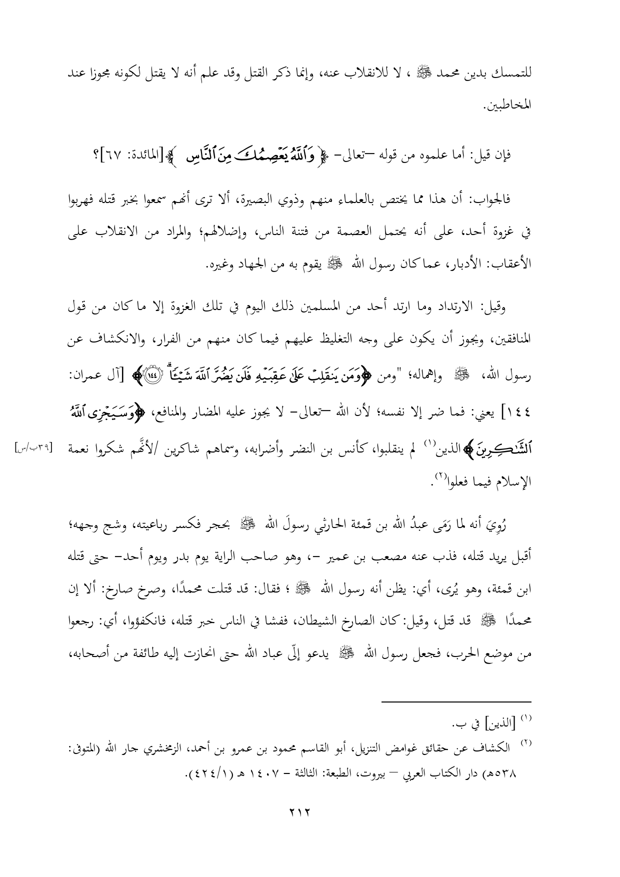 (¬٢) الكشاف عن حقائق غوامض التنزيل، أبو القاسم محمود بن عمرو بن أحمد، الزمخشري جار الله (المتوفى: ٥٣٨ هـ) دار الكتاب العربي - بيروت، الطبعة: الثالثة - ١٤٠٧ هـ (١/ ٤٢٤).
