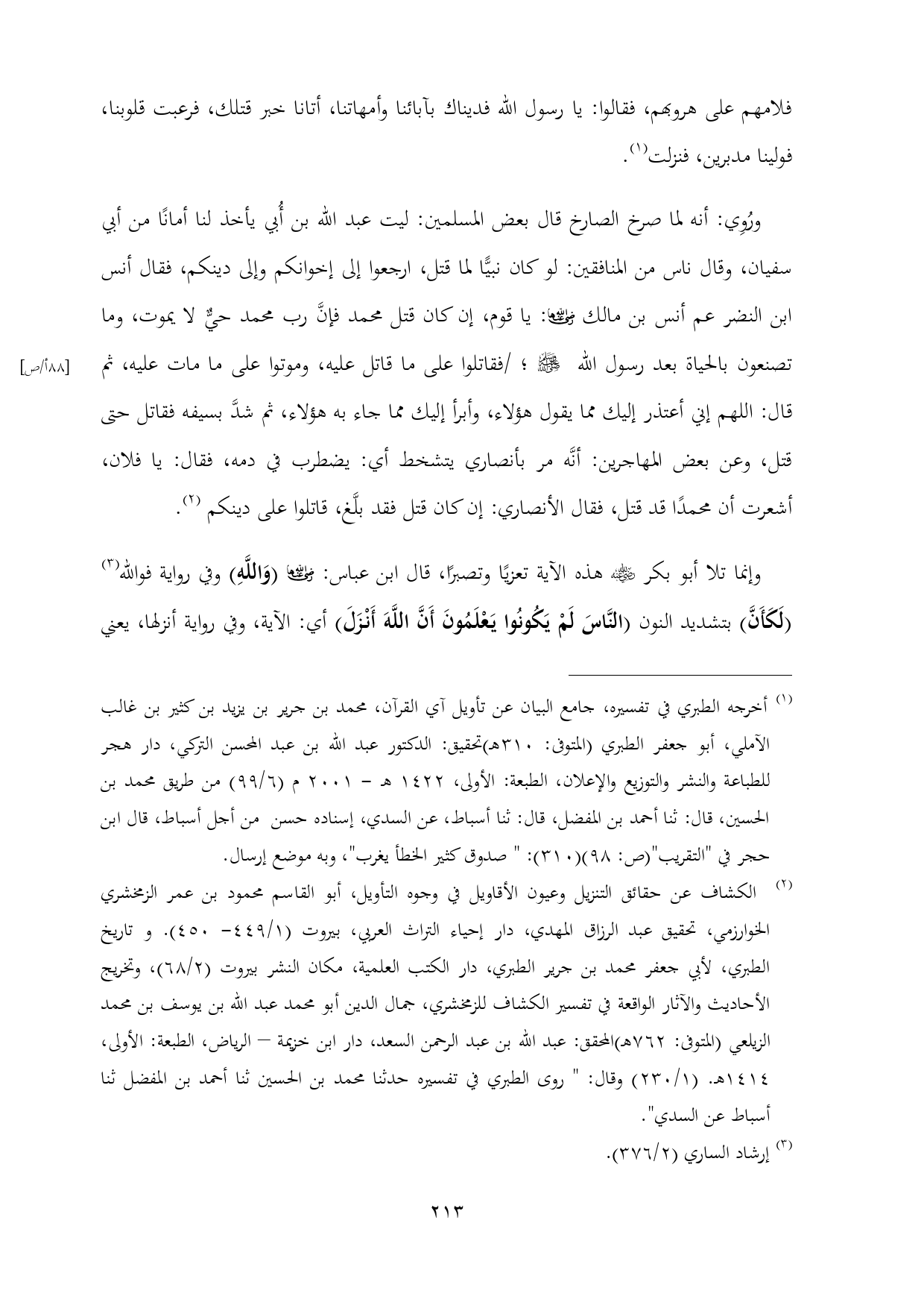 ورُوِي: أنه لما صرخ الصارخ قال بعض المسلمين: ليت عبد الله بن أُبي يأخذ لنا أمانًا من أبي سفيان، وقال ناس من المنافقين: لو كان نبيًّا لما قتل، ارجعوا إلى إخوانكم وإلى دينكم، فقال أنس ابن النضر عم أنس بن مالك - رضي الله عنها -: يا قوم، إن كان قتل محمد فإنَّ رب محمد حيٌّ لا يموت، وما تصنعون بالحياة بعد رسول الله - صلى الله عليه وسلم -؛ /فقاتلوا على ما قاتل عليه، وموتوا على ما مات عليه، ثم قال: اللهم إني أعتذر إليك مما يقول هؤلاء، وأبرأ إليك مما جاء به هؤلاء، ثم شدَّ بسيفه فقاتل حتى قتل، وعن بعض المهاجرين: أنَّه مر بأنصاري يتشخط أي: يضطرب في دمه، فقال: يا فلان، أشعرت أن محمدًا قد قتل، فقال الأنصاري: إن كان قتل فقد بلَّغ، قاتلوا على دينكم (¬٢).