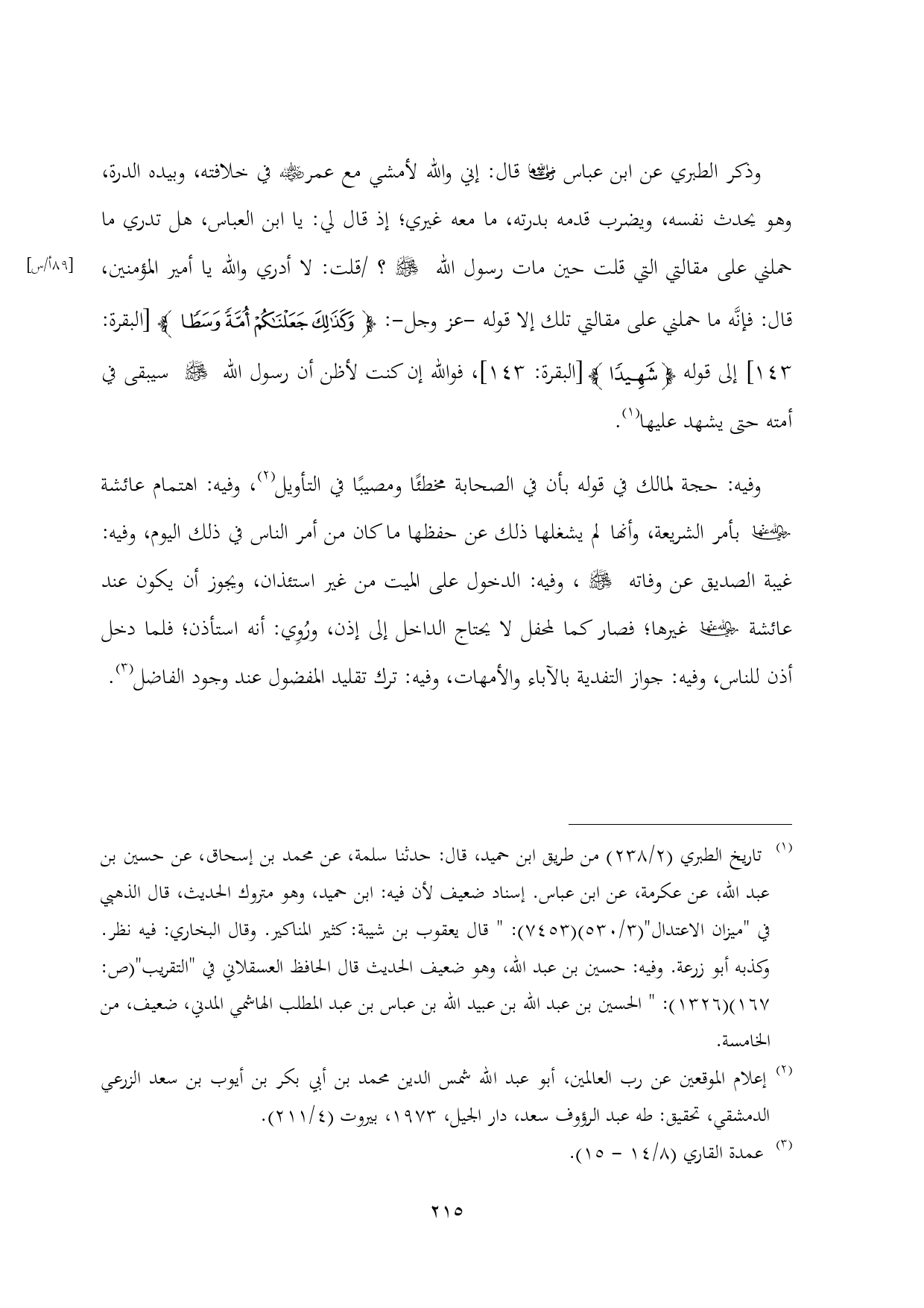 وذكر الطبري عن ابن عباس - رضي الله عنها - قال: إني والله لأمشي مع عمر - رضي الله عنه - في خلافته، وبيده الدرة، وهو يحدث نفسه، ويضرب قدمه بدرته، ما معه غيري؛ إذ قال لي: يا ابن العباس، هل تدري ما حملني على مقالتي التي قلت حين مات رسول الله - صلى الله عليه وسلم -؟ /قلت: لا أدري والله يا أمير المؤمنين، قال: فإنَّه ما حملني على مقالتي تلك إلا قوله -عز وجل-: {وَكَذَلِكَ جَعَلْنَاكُمْ أُمَّةً وَسَطًا} [البقرة: ١٤٣] إلى قوله {شَهِيدًا} [البقرة: ١٤٣]، فوالله إن كنت لأظن أن رسول الله - صلى الله عليه وسلم - سيبقى في أمته حتى يشهد عليها (¬١).