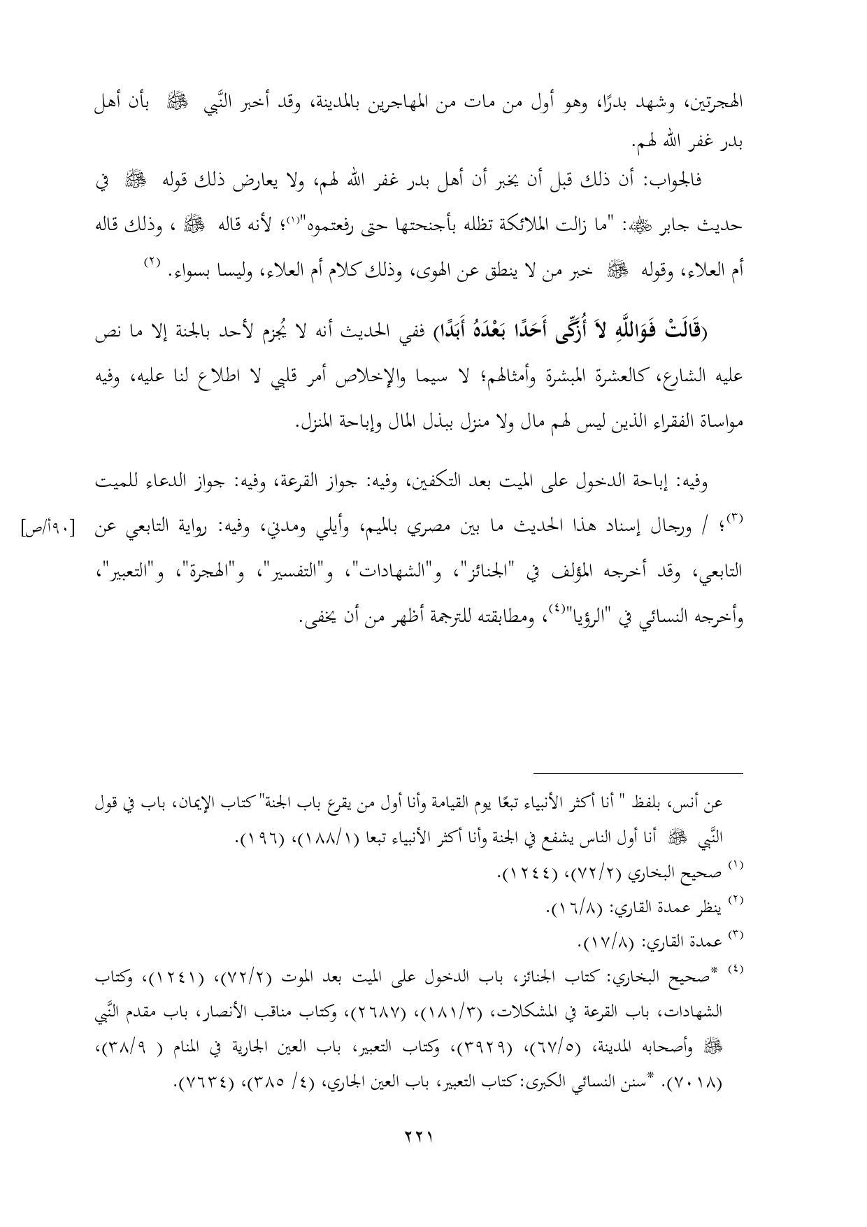 فالجواب: أن ذلك قبل أن يخبر أن أهل بدر غفر الله لهم، ولا يعارض ذلك قوله - صلى الله عليه وسلم - في حديث جابر - رضي الله عنه -: "ما زالت الملائكة تظله بأجنحتها حتى رفعتموه" (¬١)؛ لأنه قاله - صلى الله عليه وسلم -، وذلك قاله أم العلاء، وقوله - صلى الله عليه وسلم - خبر من لا ينطق عن الهوى، وذلك كلام أم العلاء، وليسا بسواء. (¬٢)