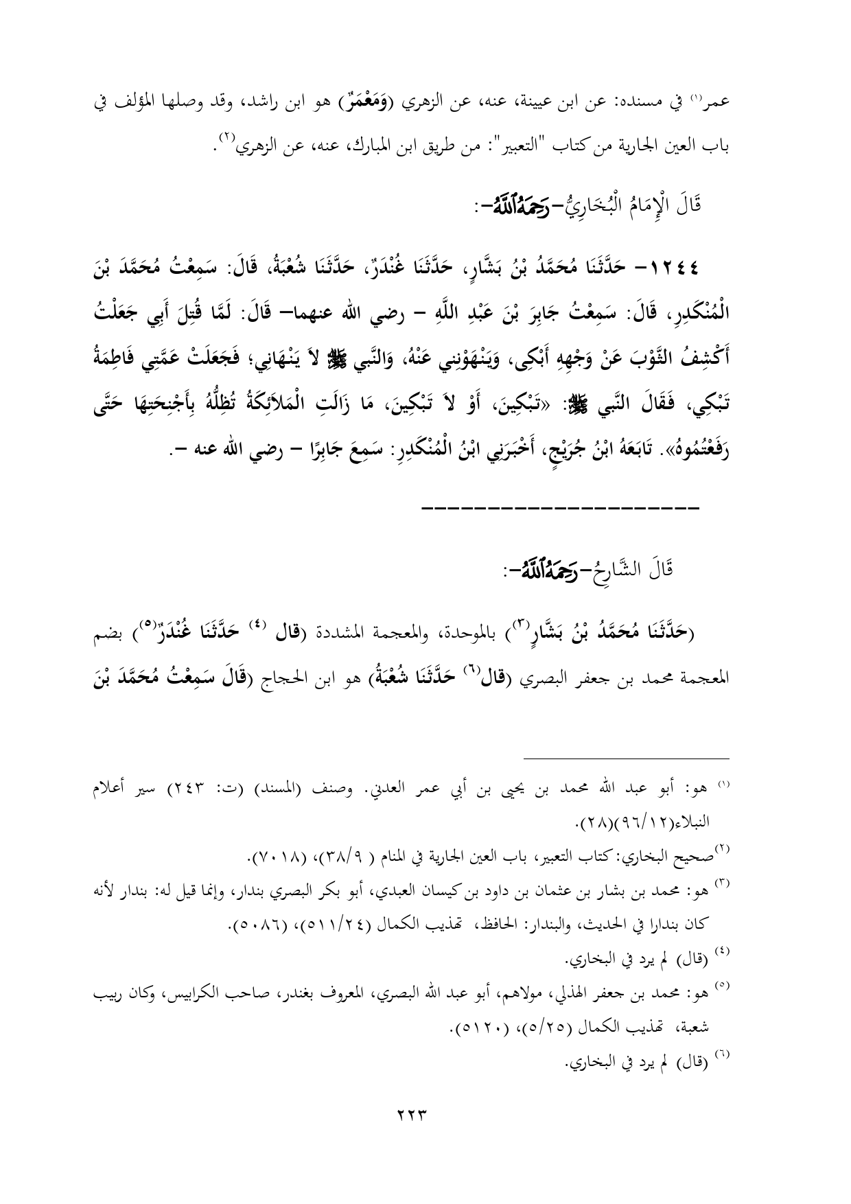 ١٢٤٤ - حَدَّثَنَا مُحَمَّدُ بْنُ بَشَّارٍ، حَدَّثَنَا غُنْدَرٌ، حَدَّثَنَا شُعْبَةُ، قَالَ: سَمِعْتُ مُحَمَّدَ بْنَ الْمُنْكَدِرِ، قَالَ: سَمِعْتُ جَابِرَ بْنَ عَبْدِ اللَّهِ - رضي الله عنهما- قَالَ: لَمَّا قُتِلَ أَبِي جَعَلْتُ أَكْشِفُ الثَّوْبَ عَنْ وَجْهِهِ أَبْكِى، وَيَنْهَوْنِني عَنْهُ، وَالنَّبي - صلى الله عليه وسلم - لَا يَنْهَانِي؛ فَجَعَلَتْ عَمَّتِي فَاطِمَةُ تَبْكِي، فَقَالَ النَّبي - صلى الله عليه وسلم -: «تَبْكِينَ، أَوْ لَا تَبْكِينَ، مَا زَالَتِ الْمَلَائِكَةُ تُظِلُّهُ بِأَجْنِحَتِهَا حَتَّى رَفَعْتُمُوهُ». تَابَعَهُ ابْنُ جُرَيْجٍ، أَخْبَرَنِي ابْنُ الْمُنْكَدِرِ: سَمِعَ جَابِرًا - رضي الله عنه -.