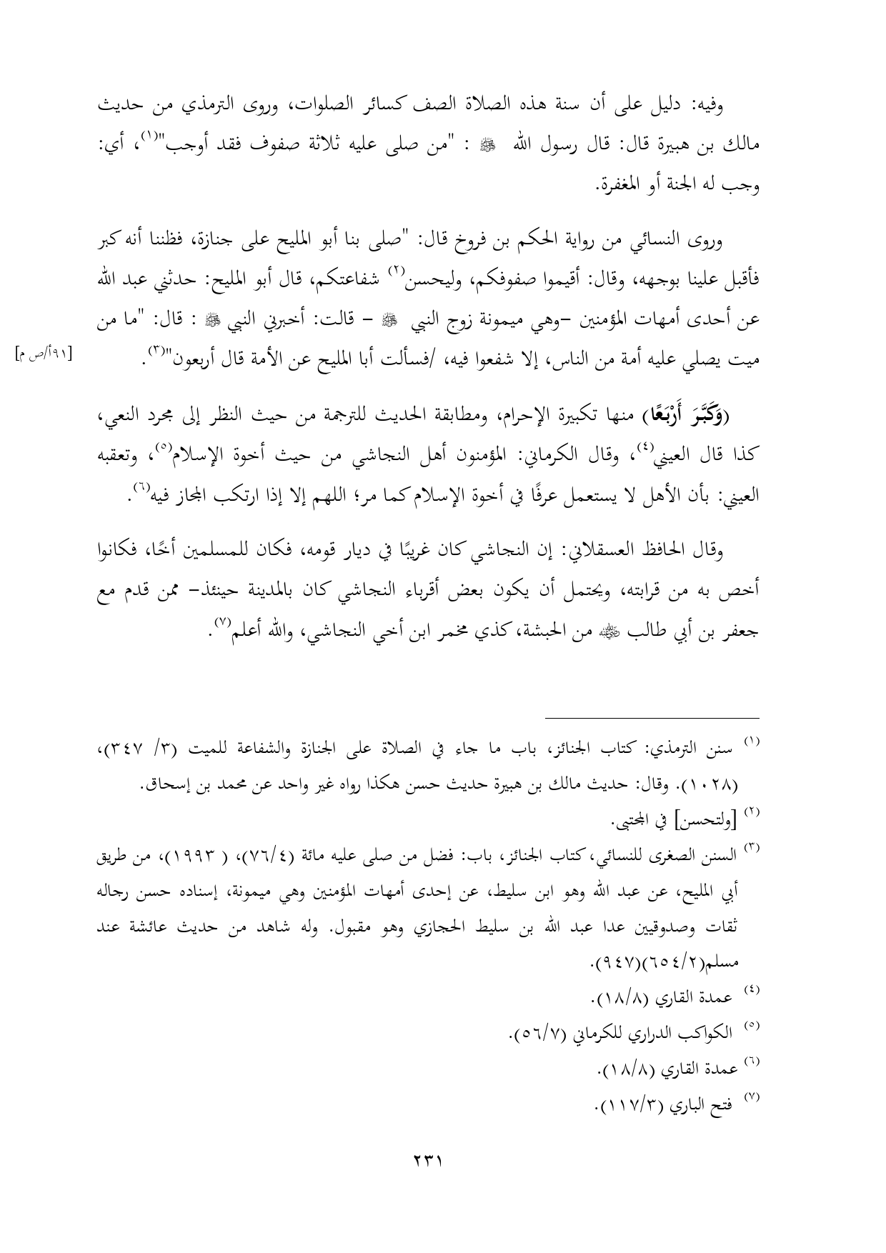 (وَكَبَّرَ أَرْبَعًا) منها تكبيرة الإحرام، ومطابقة الحديث للترجمة من حيث النظر إلى مجرد النعي، كذا قال العيني (¬٤)، وقال الكرماني: المؤمنون أهل النجاشي من حيث أخوة الإسلام (¬٥)، وتعقبه العيني: بأن الأهل لا يستعمل عرفًا في أخوة الإسلام كما مر؛ اللهم إلا إذا ارتكب المجاز فيه (¬٦).