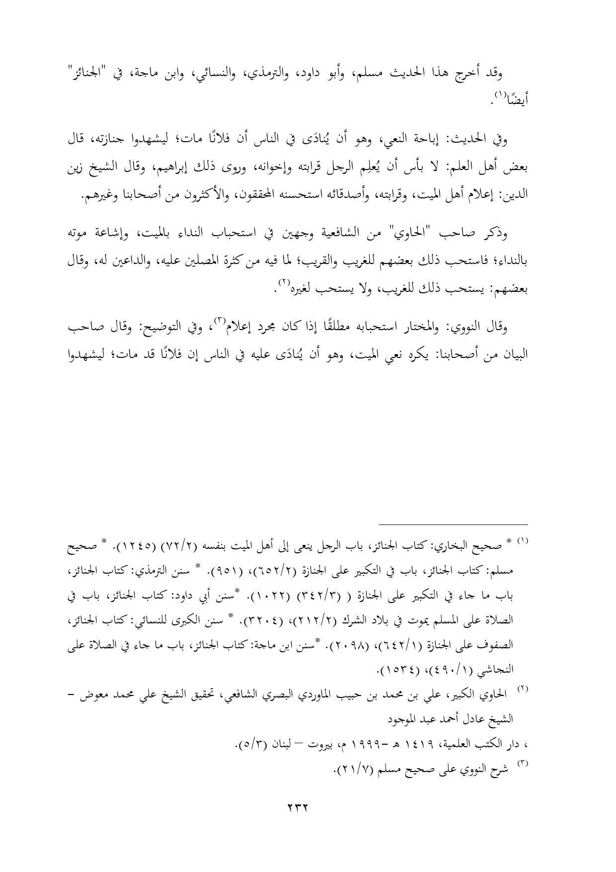 وذكر صاحب "الحاوي" من الشافعية وجهين في استحباب النداء بالميت، وإشاعة موته بالنداء؛ فاستحب ذلك بعضهم للغريب والقريب؛ لما فيه من كثرة المصلين عليه، والداعين له، وقال بعضهم: يستحب ذلك للغريب، ولا يستحب لغيره (¬٢).