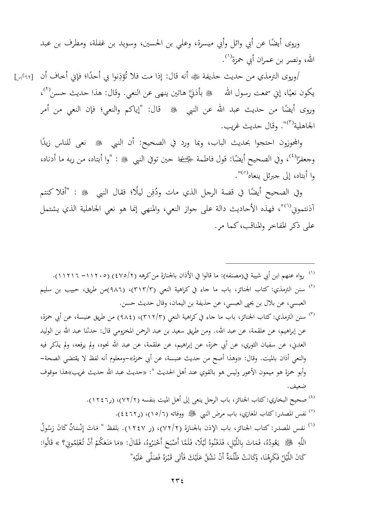 (¬٣) سنن الترمذي: كتاب الجنائز، باب ما جاء في كراهية النعي (٣/ ٣١٢)، (٩٨٤) من طريق عنبسة، عن أبي حمزة، عن إبراهيم، عن علقمة، عن عبد الله،. ومن طريق سعيد بن عبد الرحمن المخزومي قال: حدثنا عبد الله بن الوليد العدني، عن سفيان الثوري، عن أبي حمزة، عن إبراهيم، عن علقمة، عن عبد الله نحوه، ولم يرفعه، ولم يذكر فيه والنعي أذان بالميت. وقال: «وهذا أصح من حديث عنبسة، عن أبي حمزة» -ومعلوم أنه لفظ لا يقتضي الصحة- وأبو حمزة هو ميمون الأعور وليس هو بالقوي عند أهل الحديث ": «حديث عبد الله حديث غريب» هذا موقوف ضعيف.