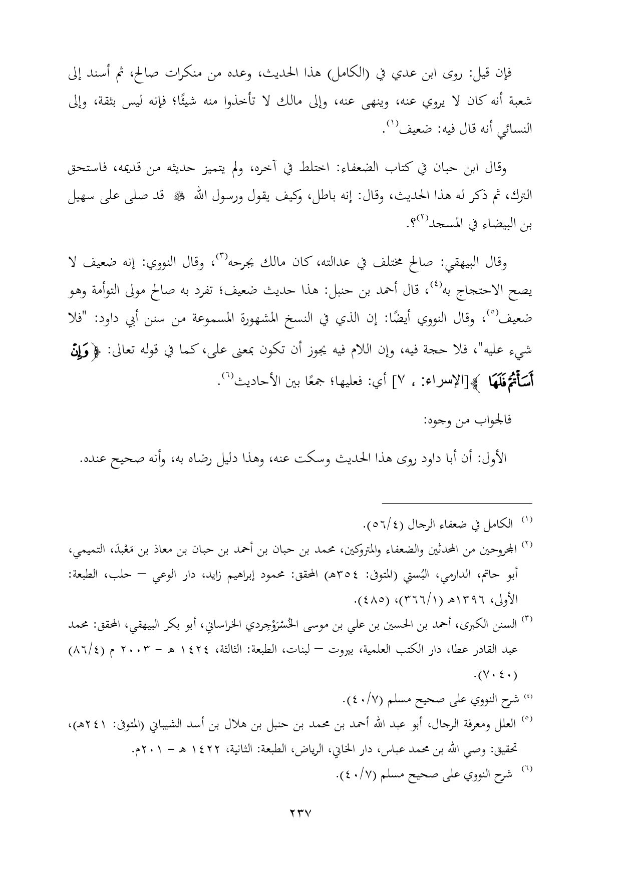وقال البيهقي: صالح مختلف في عدالته، كان مالك يجرحه (¬٣)، وقال النووي: إنه ضعيف لا يصح الاحتجاج به (¬٤)، قال أحمد بن حنبل: هذا حديث ضعيف؛ تفرد به صالح مولى التوأمة وهو ضعيف (¬٥)، وقال النووي أيضًا: إن الذي في النسخ المشهورة المسموعة من سنن أبي داود: "فلا شيء عليه"، فلا حجة فيه، وإن اللام فيه يجوز أن تكون بمعنى على، كما في قوله تعالى: {وَإِنْ أَسَأْتُمْ فَلَهَا} [الإسراء:، ٧] أي: فعليها؛ جمعًا بين الأحاديث (¬٦).