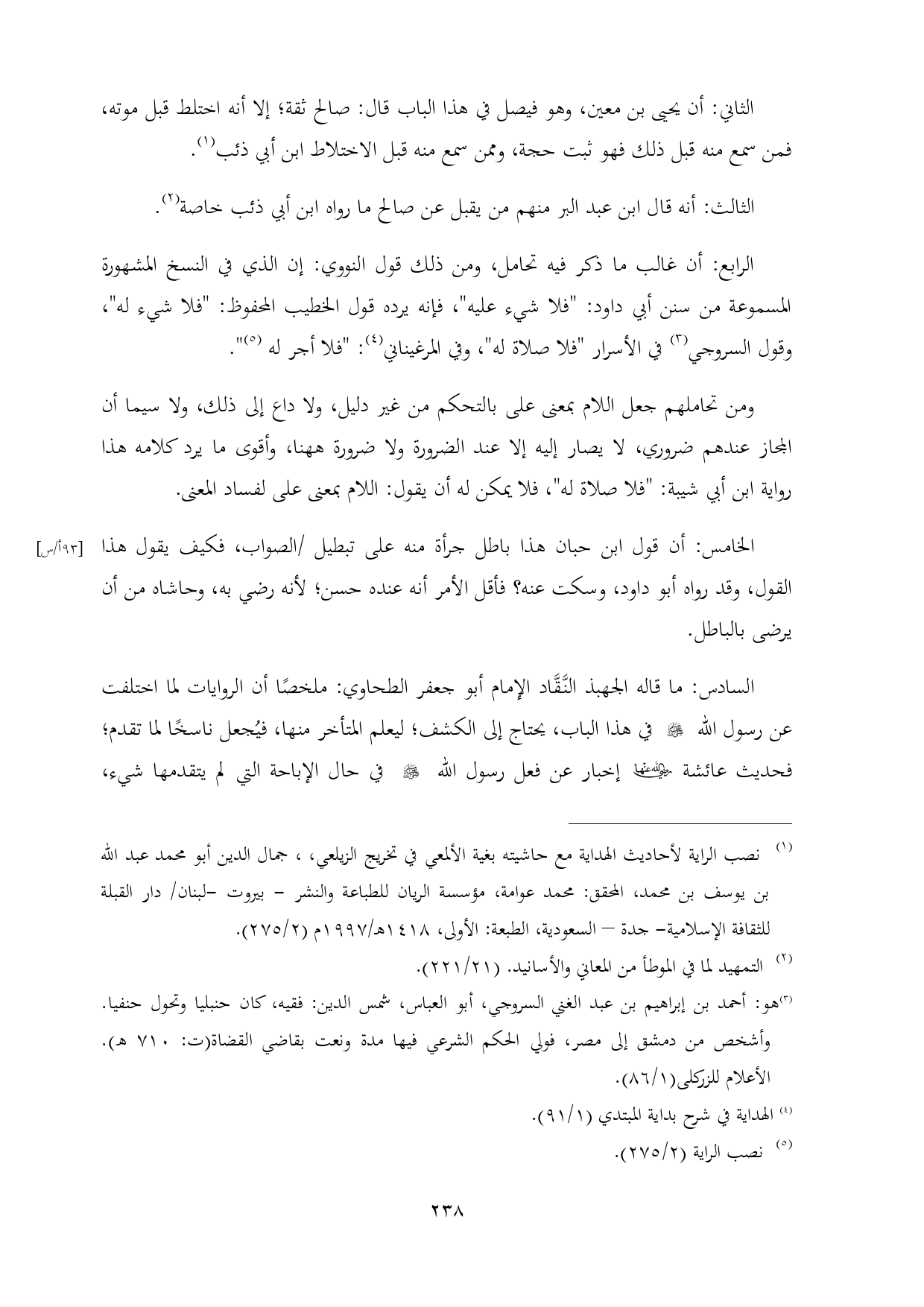 الرابع: أن غالب ما ذكر فيه تحامل، ومن ذلك قول النووي: إن الذي في النسخ المشهورة المسموعة من سنن أبي داود: "فلا شيء عليه"، فإنه يرده قول الخطيب المحفوظ: "فلا شيء له"، وقول السروجي (¬٣) في الأسرار "فلا صلاة له"، وفي المرغيناني (¬٤): "فلا أجر له (¬٥) ".