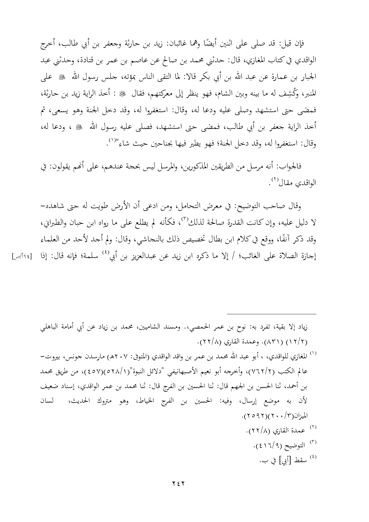 فإن قيل: قد صلى على اثنين أيضًا وهما غائبان: زيد بن حارثة وجعفر بن أبي طالب، أخرج الواقدي في كتاب المغازي، قال: حدثني محمد بن صالح عن عاصم بن عمر بن قتادة، وحدثني عبد الجبار بن عمارة عن عبد الله بن أبي بكر قالا: لما التقى الناس بمؤته، جلس رسول الله - صلى الله عليه وسلم - على المنبر، وكُشِف له ما بينه وبين الشام، فهو ينظر إلى معركتهم، فقال - صلى الله عليه وسلم -: أخذ الراية زيد بن حارثة، فمضى حتى استشهد وصلى عليه ودعا له، وقال: استغفروا له، وقد دخل الجنة وهو يسعى، ثم أخذ الراية جعفر بن أبي طالب، فمضى حتى استشهد، فصلى عليه رسول الله - صلى الله عليه وسلم -، ودعا له، وقال: استغفروا له، وقد دخل الجنة؛ فهو يطير فيها بجناحين حيث شاء" (¬١).