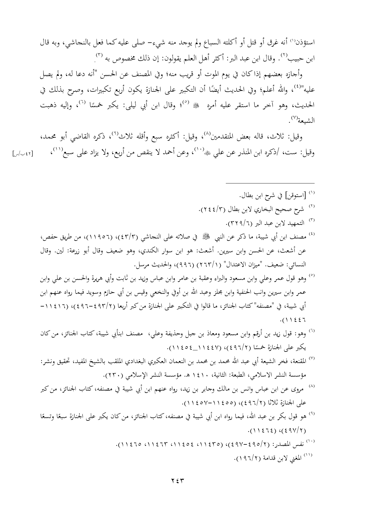 (¬٩) هو قول بكر بن عبد الله، فيما رواه ابن أبي شيبة في مصنفه، كتاب الجنائز، من كان يكبر على الجنازة سبعًا وتسعًا (٢/ ٤٩٧)، (١١٤٦٤).