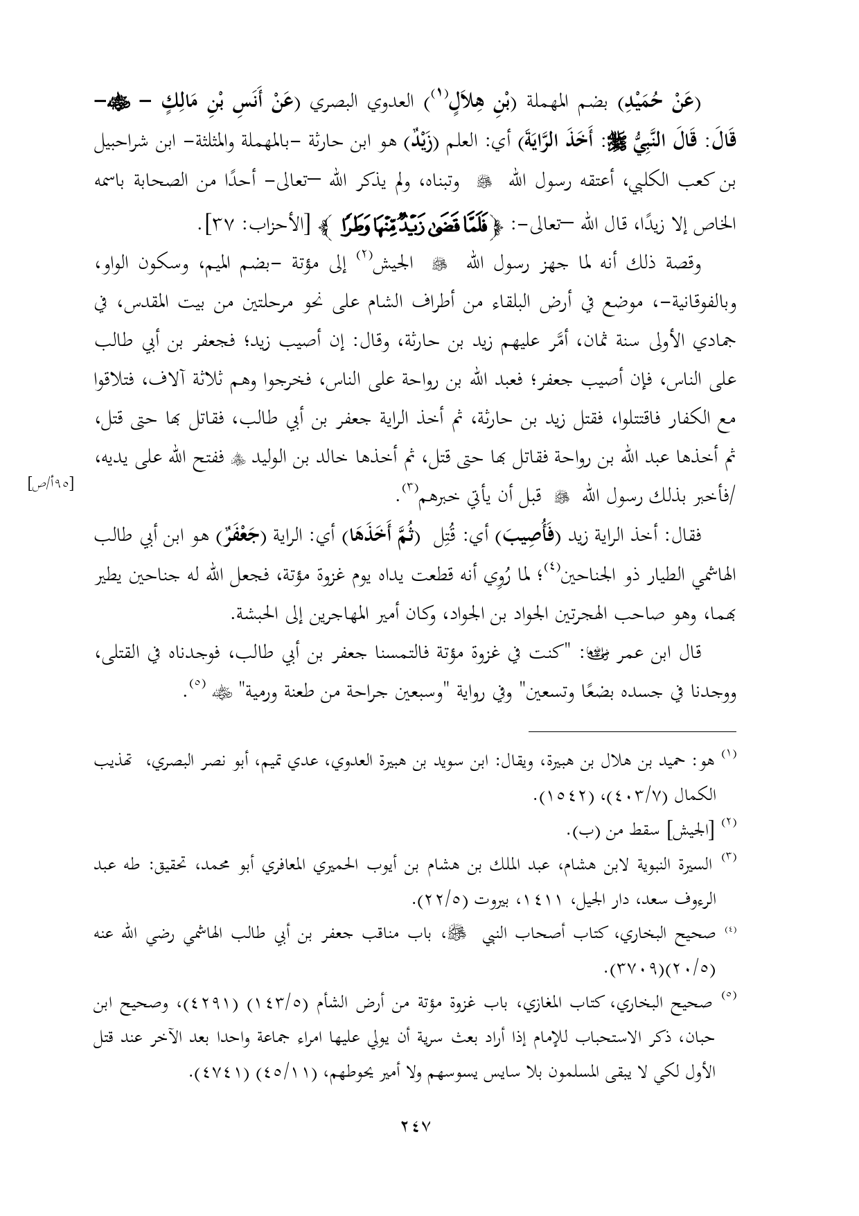 (¬٥) صحيح البخاري، كتاب المغازي، باب غزوة مؤتة من أرض الشأم (٥/ ١٤٣) (٤٢٩١)، وصحيح ابن حبان، ذكر الاستحباب للإمام إذا أراد بعث سرية أن يولي عليها امراء جماعة واحدا بعد الآخر عند قتل الأول لكي لا يبقى المسلمون بلا سايس يسوسهم ولا أمير يحوطهم، (١١/ ٤٥) (٤٧٤١).