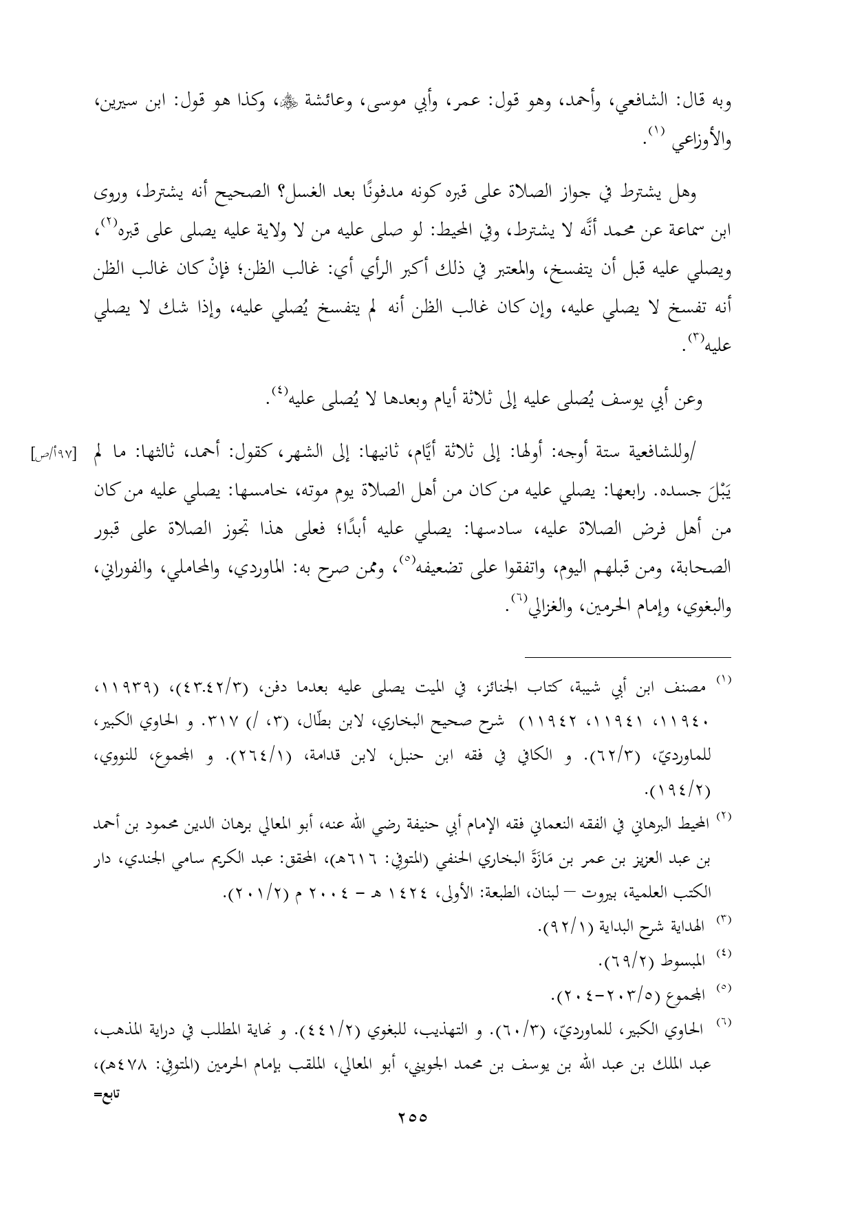 /وللشافعية ستة أوجه: أولها: إلى ثلاثة أيَّام، ثانيها: إلى الشهر، كقول: أحمد، ثالثها: ما لم يَبْلَ جسده. رابعها: يصلي عليه من كان من أهل الصلاة يوم موته، خامسها: يصلي عليه من كان من أهل فرض الصلاة عليه، سادسها: يصلي عليه أبدًا؛ فعلى هذا تجوز الصلاة على قبور الصحابة، ومن قبلهم اليوم، واتفقوا على تضعيفه (¬٥)، وممن صرح به: الماوردي، والمحاملي، والفوراني، والبغوي، وإمام الحرمين، والغزالي (¬٦).
