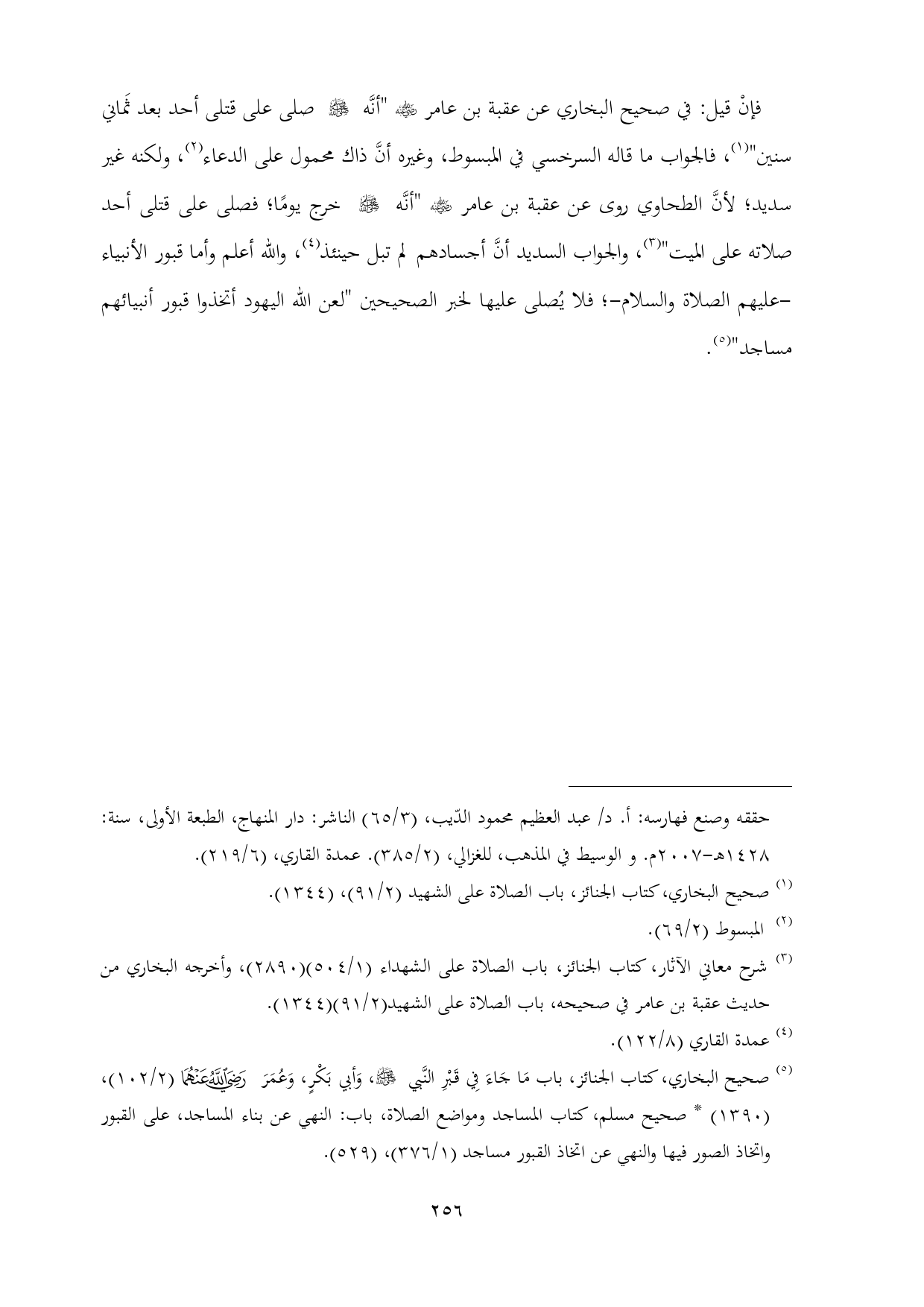 فإنْ قيل: في صحيح البخاري عن عقبة بن عامر - رضي الله عنه - "أنَّه - صلى الله عليه وسلم - صلى على قتلى أحد بعد ثَماني سنين" (¬١)، فالجواب ما قاله السرخسي في المبسوط، وغيره أنَّ ذاك محمول على الدعاء (¬٢)، ولكنه غير سديد؛ لأنَّ الطحاوي روى عن عقبة بن عامر - رضي الله عنه - "أنَّه - صلى الله عليه وسلم - خرج يومًا؛ فصلى على قتلى أحد صلاته على الميت" (¬٣)، والجواب السديد أنَّ أجسادهم لم تبل حينئذ (¬٤)، والله أعلم وأما قبور الأنبياء -عليهم الصلاة والسلام-؛ فلا يُصلى عليها لخبر الصحيحين "لعن الله اليهود أتخذوا قبور أنبيائهم مساجد" (¬٥).