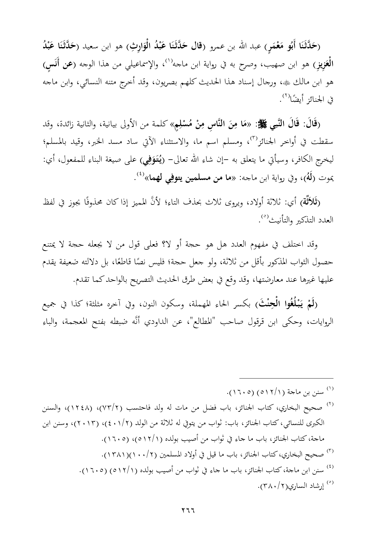 (قَالَ: قَالَ النَّبي - صلى الله عليه وسلم -: «مَا مِنَ النَّاسِ مِنْ مُسْلِمٍ» كلمة من الأولى بيانية، والثانية زائدة، وقد سقطت في أواخر الجنائز (¬٣)، ومسلم اسم ما، والاستثناء الآتي ساد مسد الخبر، وقيد بالمسلم؛ ليخرج الكافر، وسيأتي ما يتعلق به -إن شاء الله تعالى- (يُتَوَفِي) على صيغة البناء للمفعول، أي: يموت (لَهُ)، وفي رواية ابن ماجه: «ما من مسلمين يتوفِي لهما» (¬٤).