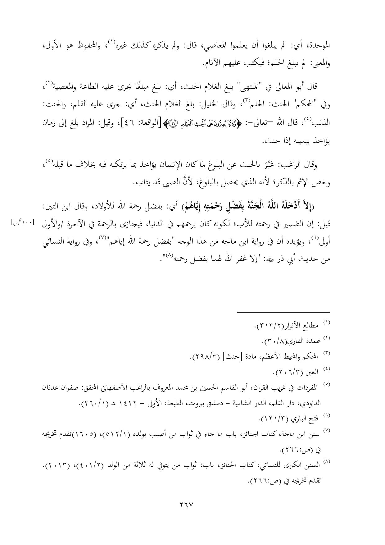 وقال الراغب: عَبَّرَ بالحنث عن البلوغ لما كان الإنسان يؤاخذ بما يرتكبه فيه بخلاف ما قبله (¬٥)، وخص الإثم بالذكر؛ لأنه الذي يحصل بالبلوغ، لأنَّ الصبي قد يثاب.