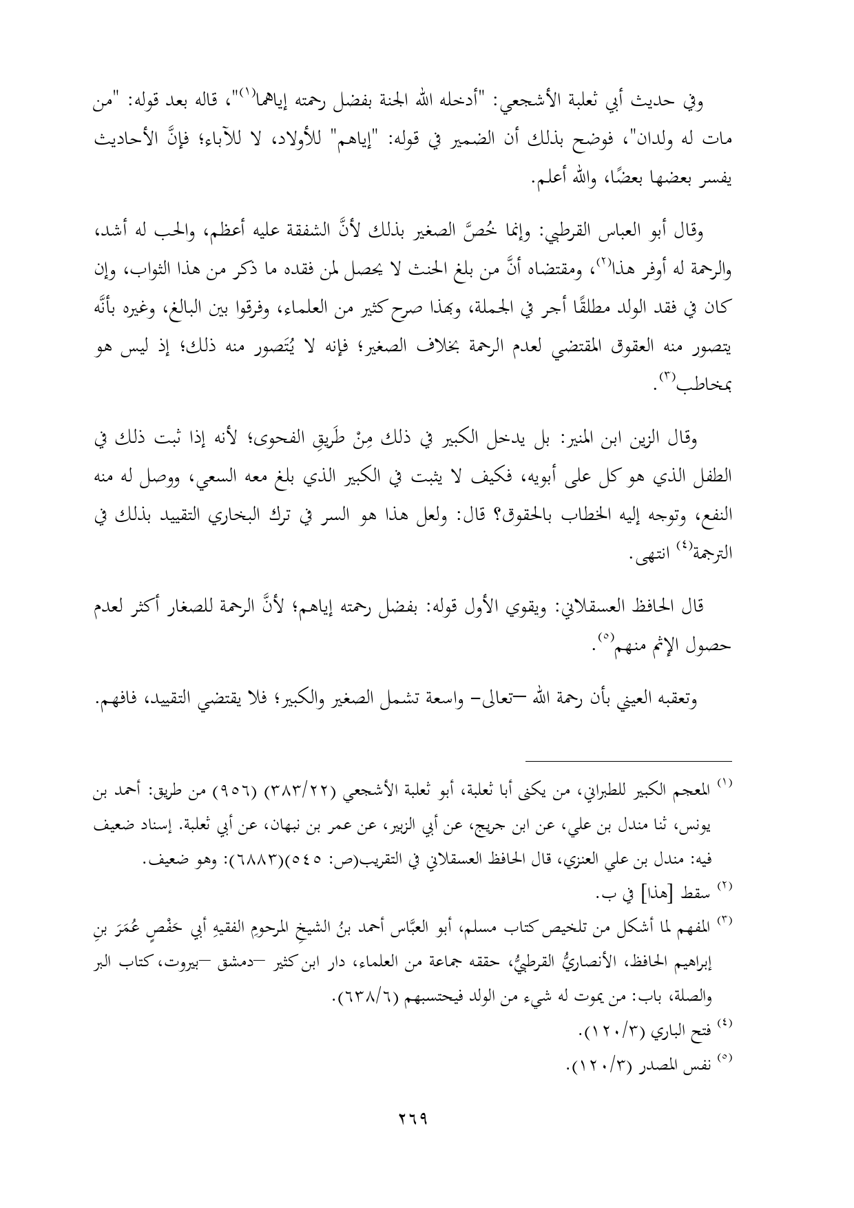 (¬٣) المفهم لما أشكل من تلخيص كتاب مسلم، أبو العبَّاس أحمد بنُ الشيخِ المرحومِ الفقيهِ أبي حَفْصٍ عُمَرَ بنِ إبراهيم الحافظ، الأنصاريُّ القرطبيُّ، حققه جماعة من العلماء، دار ابن كثير -دمشق -بيروت، كتاب البر والصلة، باب: من يموت له شيء من الولد فيحتسبهم (٦/ ٦٣٨).