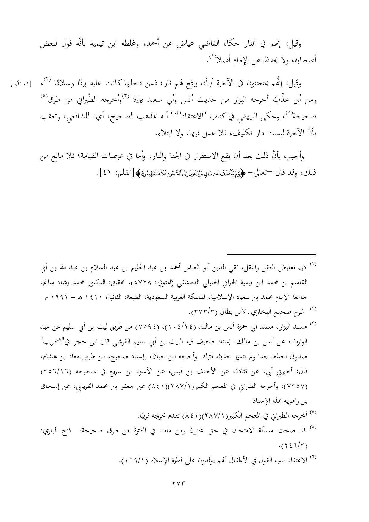 وقيل: إنَّهم يمتحنون في الآخرة /بأن يرفع لهم نار، فمن دخلها كانت عليه بردًا وسلامًا (¬٢)، ومن أبى عذِّبَ أخرجه البزار من حديث أنس وأبي سعيد - رضي الله عنها - (¬٣) وأخرجه الطَّبراني من طرق (¬٤) صحيحة (¬٥)، وحكى البيهقي في كتاب "الاعتقاد" (¬٦) أنه المذهب الصحيح، أي: للشافعي، وتعقب بأنَّ الآخرة ليست دار تكليف، فلا عمل فيها، ولا ابتلاء.