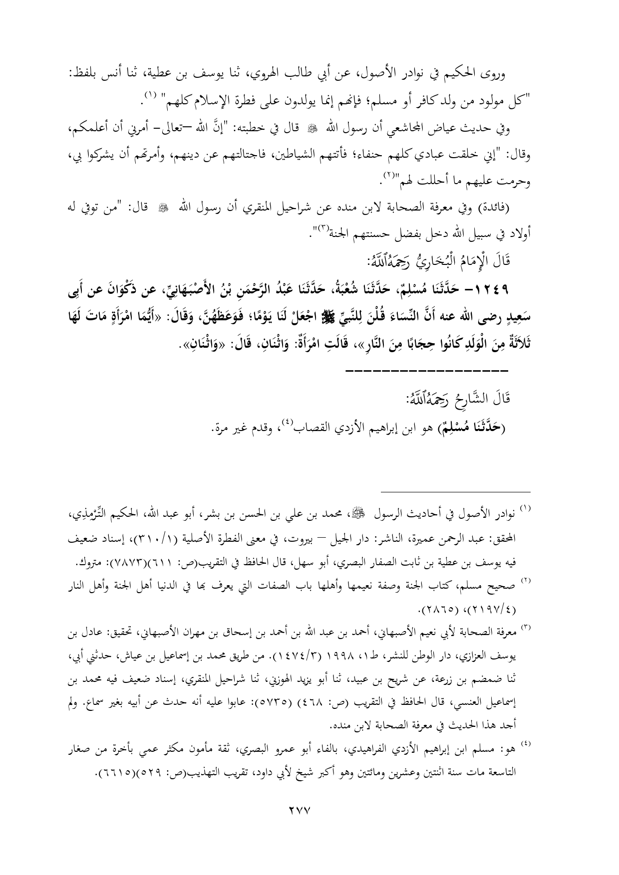 ١٢٤٩ - حَدَّثَنَا مُسْلِمٌ، حَدَّثَنَا شُعْبَةُ، حَدَّثَنَا عَبْدُ الرَّحْمَنِ بْنُ الأَصْبَهَانِيِّ، عن ذَكْوَانَ عن أَبِى سَعِيدٍ رضى الله عنه أَنَّ النِّسَاءَ قُلْنَ لِلنَّبيِّ - صلى الله عليه وسلم - اجْعَلْ لَنَا يَوْمًا؛ فَوَعَظَهُنَّ، وَقَالَ: «أَيُّمَا امْرَأَةٍ مَاتَ لَهَا ثَلَاثَةٌ مِنَ الْوَلَدِ كَانُوا حِجَابًا مِنَ النَّارِ»، قَالَتِ امْرَأَةٌ: وَاثْنَانِ، قَالَ: «وَاثْنَانِ».