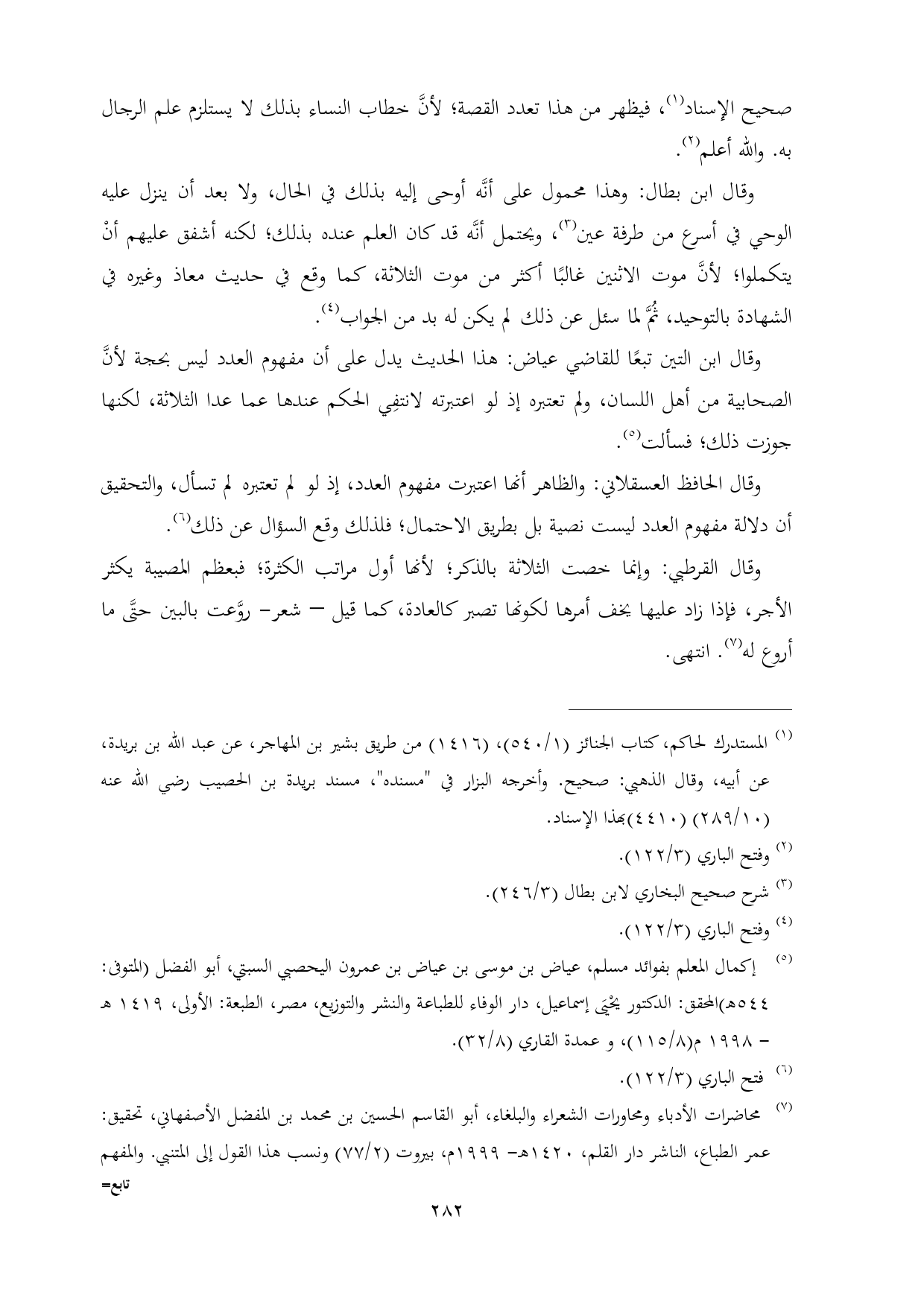(¬٧) محاضرات الأدباء ومحاورات الشعراء والبلغاء، أبو القاسم الحسين بن محمد بن المفضل الأصفهاني، تحقيق: عمر الطباع، الناشر دار القلم، ١٤٢٠ هـ- ١٩٩٩ م، بيروت (٢/ ٧٧) ونسب هذا القول إلى المتنبي. والمفهم لما أشكل من تلخيص كتاب مسلم، كتاب البر والصلة، باب: من يموت له شيء من الولد فيحتسبهم (٦/ ٦٣٨). وفتح الباري (٣/ ١٢٢) وعمدة القاري (٨/ ٣٢).