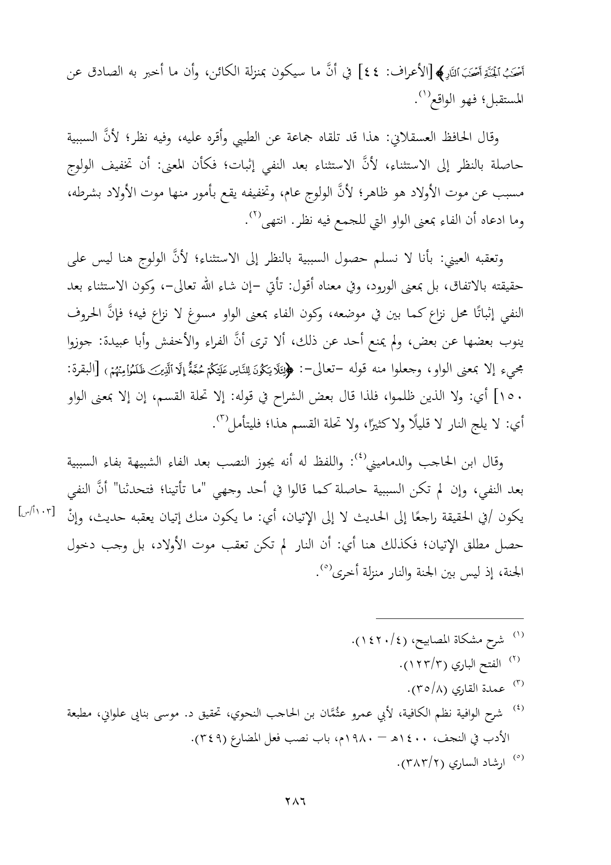 وتعقبه العيني: بأنا لا نسلم حصول السببية بالنظر إلى الاستثناء؛ لأنَّ الولوج هنا ليس على حقيقته بالاتفاق، بل بمعنى الورود، وفي معناه أقول: تأتي -إن شاء الله تعالى-، وكون الاستثناء بعد النفي إثباتًا محل نزاع كما بين في موضعه، وكون الفاء بمعنى الواو مسوغ لا نزاع فيه؛ فإنَّ الحروف ينوب بعضها عن بعض، ولم يمنع أحد عن ذلك، ألا ترى أنَّ الفراء والأخفش وأبا عبيدة: جوزوا مجيء إلا بمعنى الواو، وجعلوا منه قوله -تعالى-: {لِئَلَّا يَكُونَ لِلنَّاسِ عَلَيْكُمْ حُجَّةٌ إِلَّا الَّذِينَ ظَلَمُوا مِنْهُمْ) [البقرة: ١٥٠] أي: ولا الذين ظلموا، فلذا قال بعض الشراح في قوله: إلا تحلة القسم، إن إلا بمعنى الواو أي: لا يلج النار لا قليلًا ولا كثيرًا، ولا تحلة القسم هذا؛ فليتأمل (¬٣).
