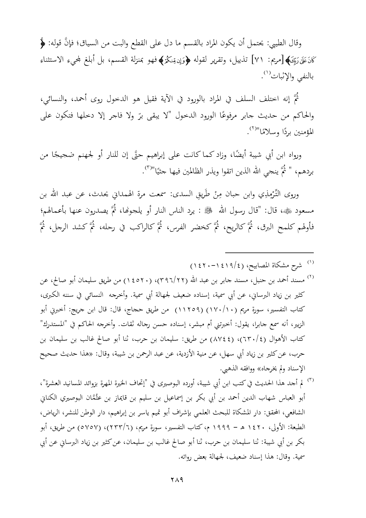 (¬٢) مسند أحمد بن حنبل، مسند جابر بن عبد الله (٢٢/ ٣٩٦)، (١٤٥٢٠) من طريق سليمان أبو صالح، عن كثير بن زياد البرساني، عن أبي سمية، إسناده ضعيف لجهالة أبي سمية. وأخرجه النسائي في سننه الكبرى، كتاب التفسير، سورة مريم (١٠/ ١٧٠) (١١٢٥٩) من طريق حجاج، قال: قال ابن جريج: أخبرني أبو الزبير، أنه سمع جابرا، يقول: أخبرتني أم مبشر، إسناده حسن رجاله ثقات. وأخرجه الحاكم في "المستدرك" كتاب الأهوال (٤/ ٦٣٠)، (٨٧٤٤) من طريق: سليمان بن حرب، ثنا أبو صالح غالب بن سليمان بن حرب، عن كثير بن زياد أبي سهل، عن منية الأزدية، عن عبد الرحمن بن شيبة، وقال: «هذا حديث صحيح الإسناد ولم يخرجاه» ووافقه الذهبي.
