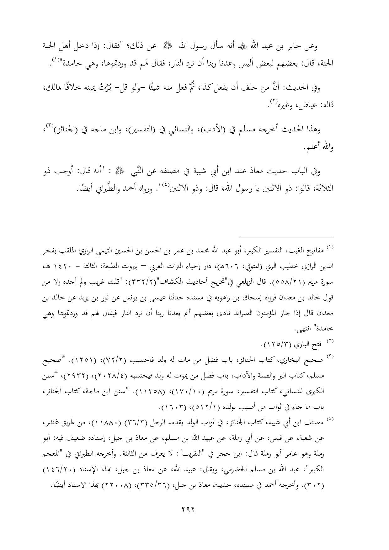 (¬٣) صحيح البخاري، كتاب الجنائز، باب فضل من مات له ولد فاحتسب (٢/ ٧٢)، (١٢٥١). *صحيح مسلم، كتاب البر والصلة والآداب، باب فضل من يموت له ولد فيحتسبه (٤/ ٢٠٢٨)، (٢٩٣٢)، *سنن الكبرى للنسائي، كتاب التفسير، سورة مريم (١٠/ ١٧٠)، (١١٢٥٨). *سنن ابن ماجة، كتاب الجنائز، باب ما جاء في ثواب من أصيب بولده (١/ ٥١٢)، (١٦٠٣).