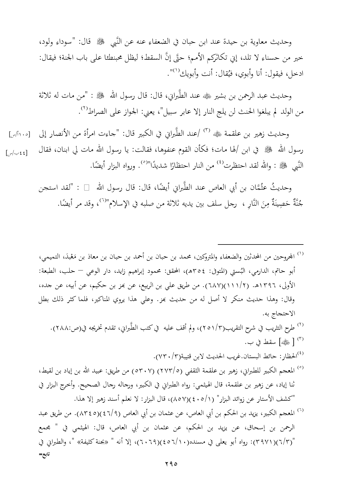 وحديث معاوية بن حيدة عند ابن حبان في الضعفاء عنه عن النَّبي - صلى الله عليه وسلم - قال: "سوداء ولود، خير من حسناء لا تلد، إني تكاثركم الأمم؛ حتَّى إنَّ السقط؛ ليظل محبنطئا على باب الجنة؛ فيقال: ادخل، فيقول: أنا وأبوي، فيُقال: أنت وأبويك (¬١) ".