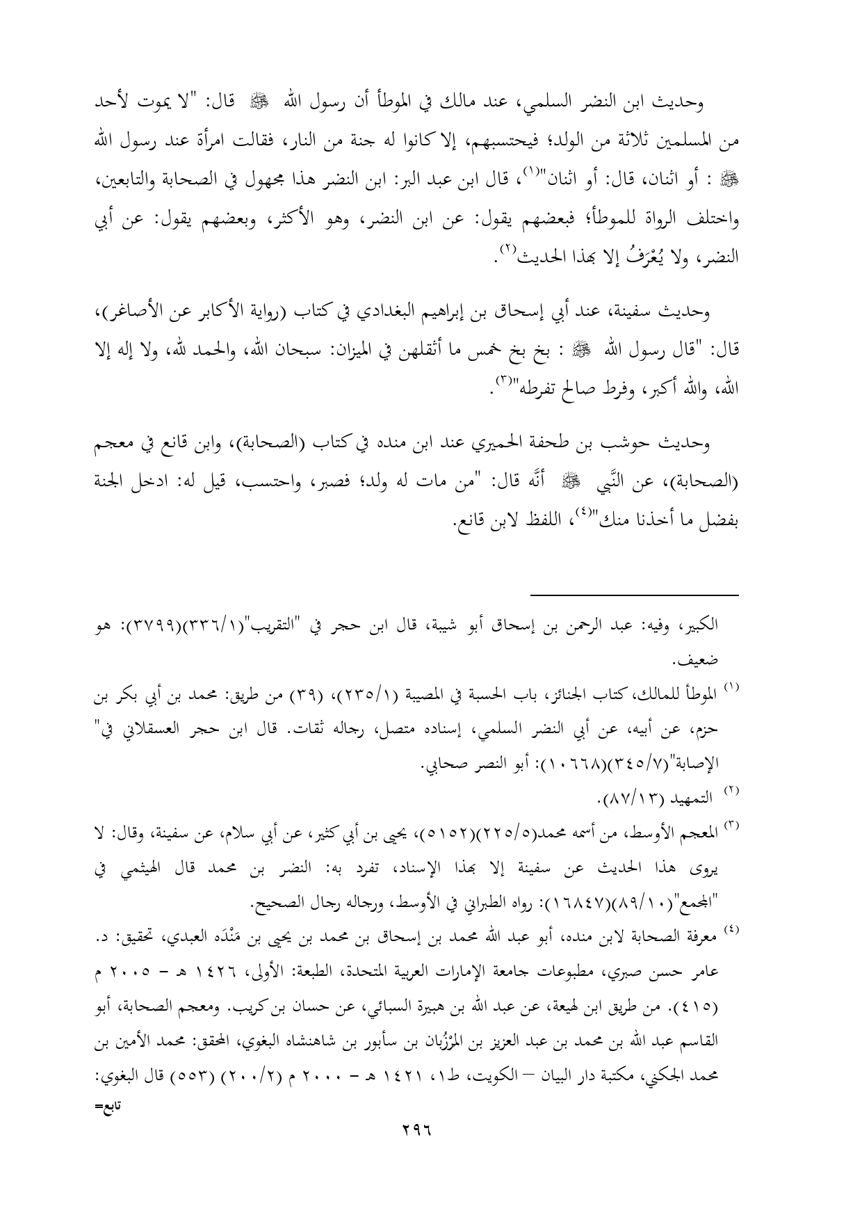 وحديث ابن النضر السلمي، عند مالك في الموطأ أن رسول الله - صلى الله عليه وسلم - قال: "لا يموت لأحد من المسلمين ثلاثة من الولد؛ فيحتسبهم، إلا كانوا له جنة من النار، فقالت امرأة عند رسول الله - صلى الله عليه وسلم -: أو اثنان، قال: أو اثنان" (¬١)، قال ابن عبد البر: ابن النضر هذا مجهول في الصحابة والتابعين، واختلف الرواة للموطأ؛ فبعضهم يقول: عن ابن النضر، وهو الأكثر، وبعضهم يقول: عن أبي النضر، ولا يُعْرَفُ إلا بهذا الحديث (¬٢).