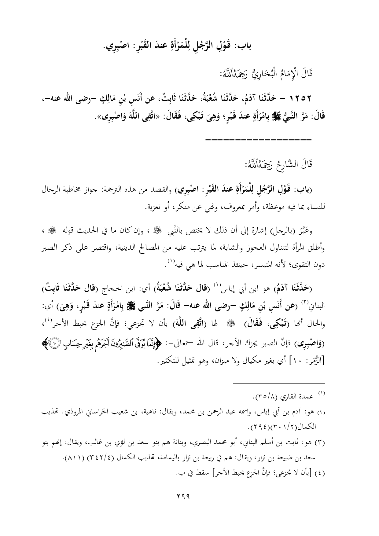 ١٢٥٢ - حَدَّثَنَا آدَمُ، حَدَّثَنَا شُعْبَةُ، حَدَّثَنَا ثَابِتٌ، عن أَنَسِ بْنِ مَالِكٍ -رضى الله عنه-، قَالَ: مَرَّ النَّبيُّ - صلى الله عليه وسلم - بِامْرَأَةٍ عندَ قَبْرٍ؛ وَهِىَ تَبْكِى، فَقَالَ: «اتَّقِى اللَّهَ وَاصْبِرِى».